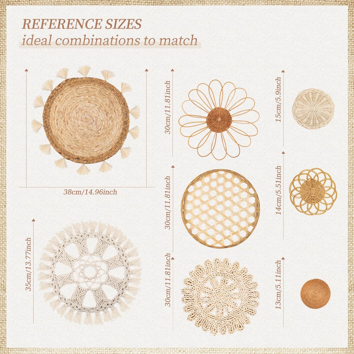 Boho Wall Basket Decor Set of 8 - Flat Woven Basket Wall Hanging Decor,Round Tassels White Macrame Tapestry Wall Decor Art,Handmade Rattan Wicker Seagrass Home Wall Baskets Decor(Boho Classic)
