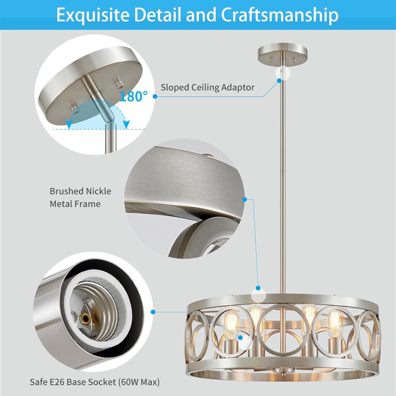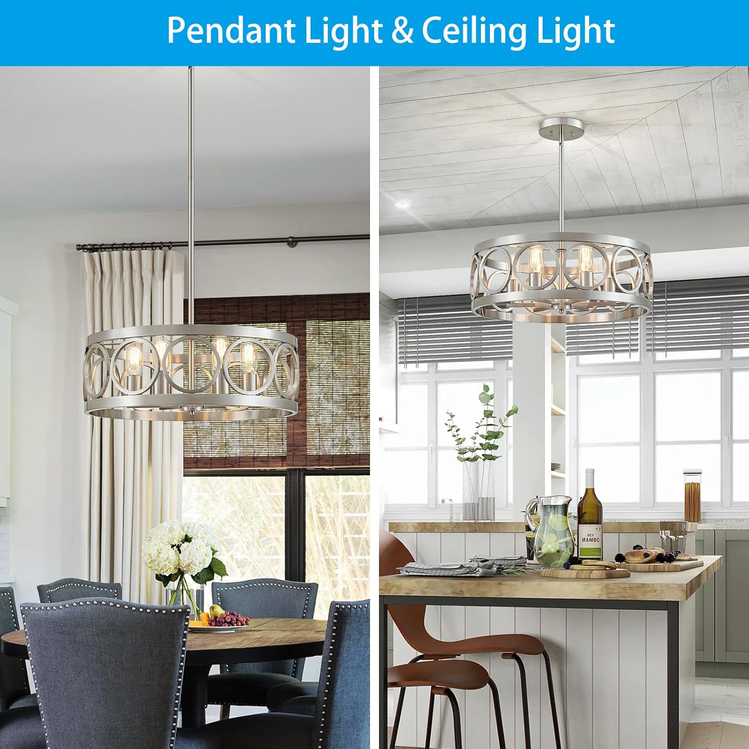 - [Perfectly Versatile] This farmhouse chandelier has a unique open drum frame with nickel finish. The chandelier is made of metal, not plastic. Beautiful and durable. It will perfectly complement decorative styles from modern to farmhouse. Brighten up your home kitchen, dining room or farmhouse style place.