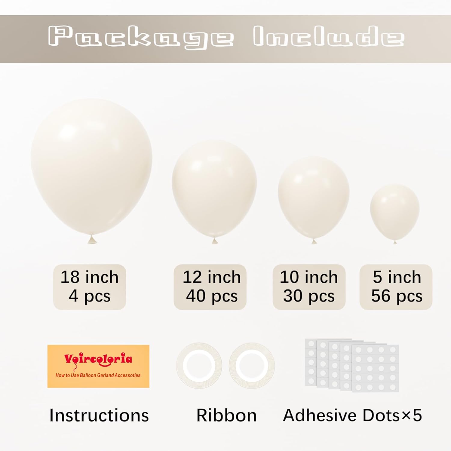 - 130pcs Sand White Balloons Set: The sand balloons package includes 56pcs 5inch, 30pcs 10inch, 40pcs 12inch, 4pcs 18inch, 2 roll of ribbons, adhesive dots(100pcs) and instruction. 5"+10"+12"+18" different sizes of white sand balloon garland kit fully meet your party needs and make your balloon garland kit look more layered