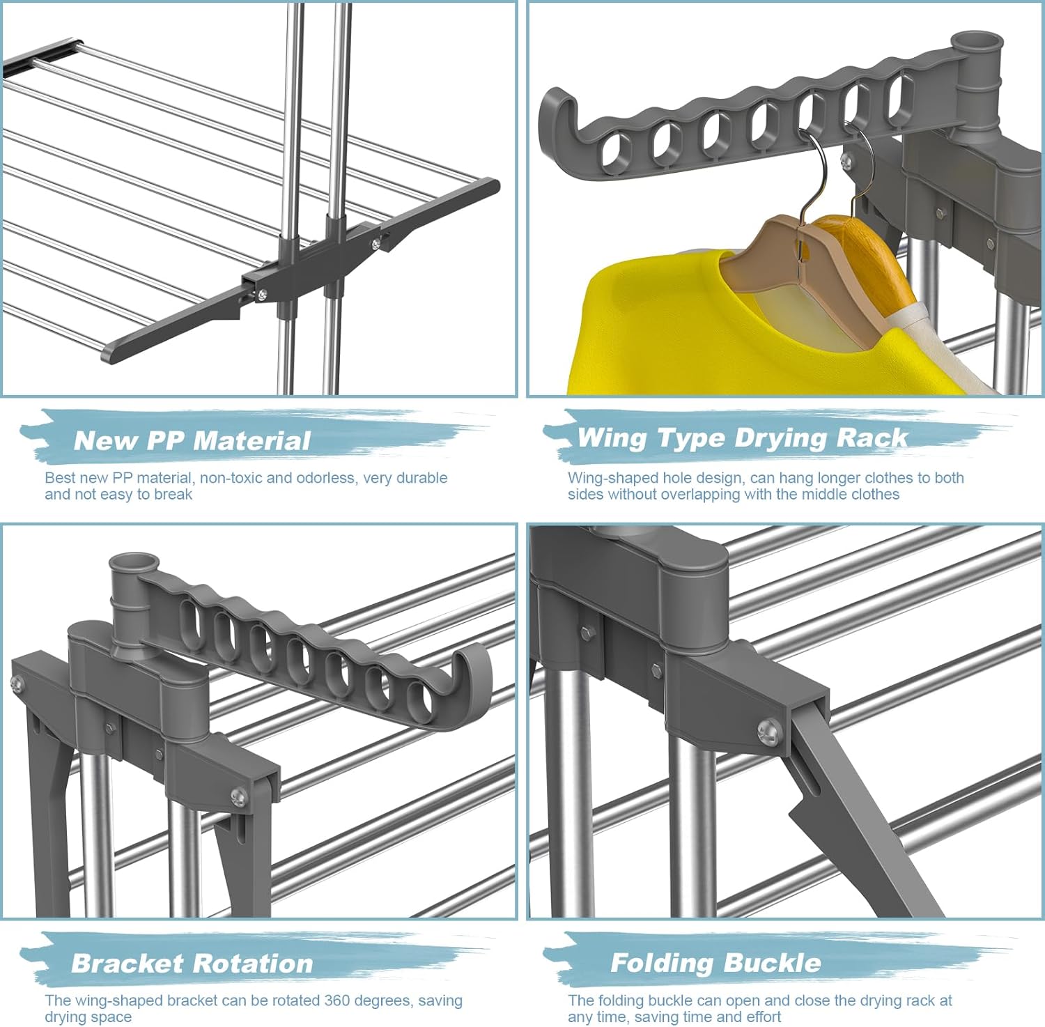 - 🧦EASY TO MOVE👔 The clothes dryer rack is equipped with 4 wheels that can be rotated 360 degrees, making it easy to move it anywhere for drying. Two of the wheels are equipped with brakes to prevent the clothes from moving while drying.