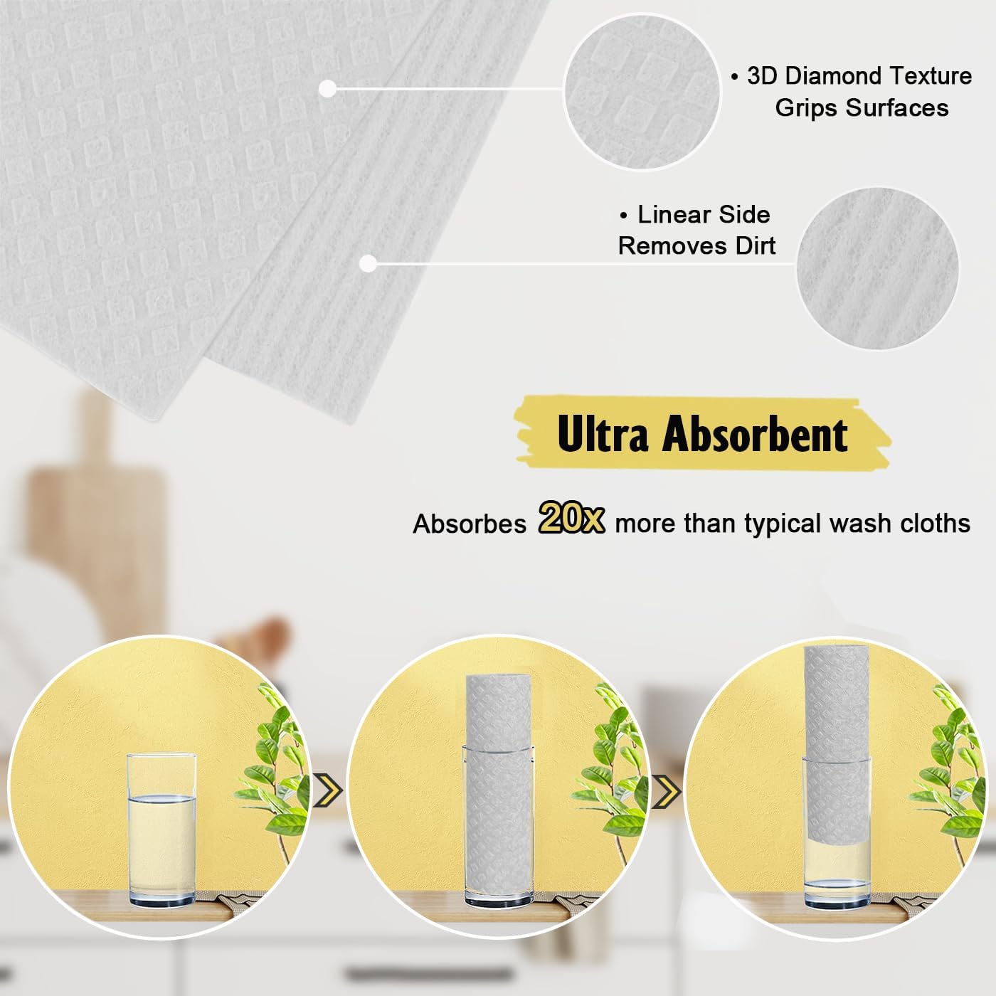 - 【Super Absorbent】Our versatile Swedish dishcloths absorb up to 20x their weight! Perfect for washing dishes, wiping surfaces and mopping up spills as well as using for the kitchen, bathroom, office and car.