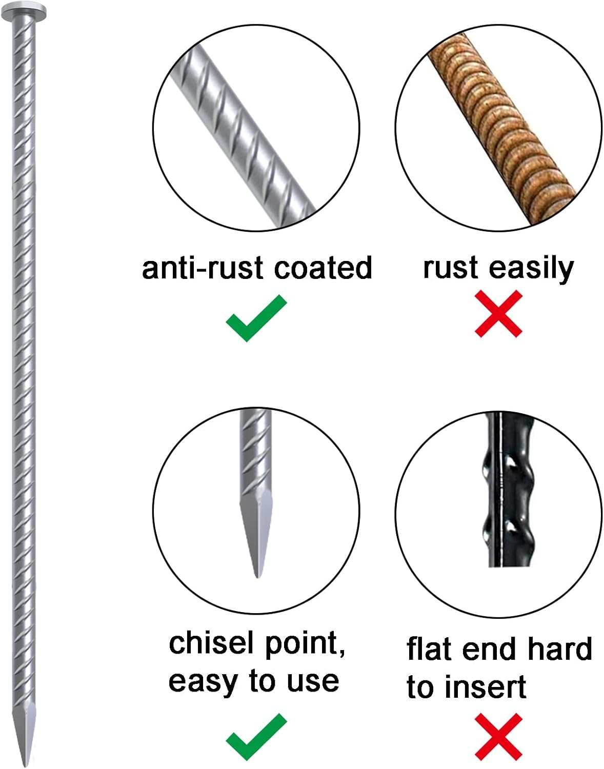 - Chisel Point End - 45 degree end makes anchoring spikes diving into all ground quickly and remove the anchors. Such as asphalt, cement, wood, sand