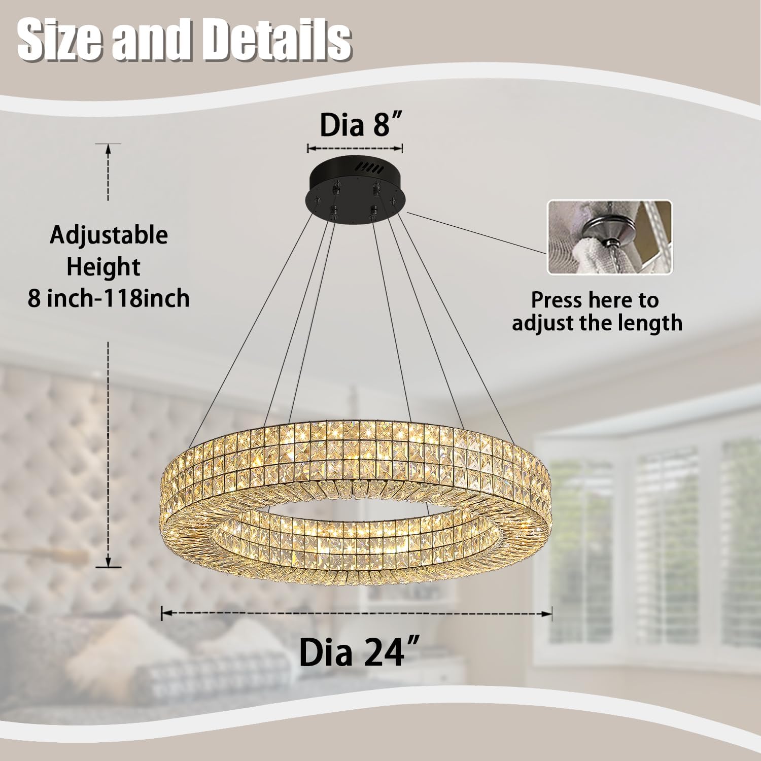 Dia 24" Modern Crystal Chandelier Black Ring Chandelier Adjustable Height Luxury Crystal Pendant Ceiling Light Fixture for Dining Living Room Bedroom