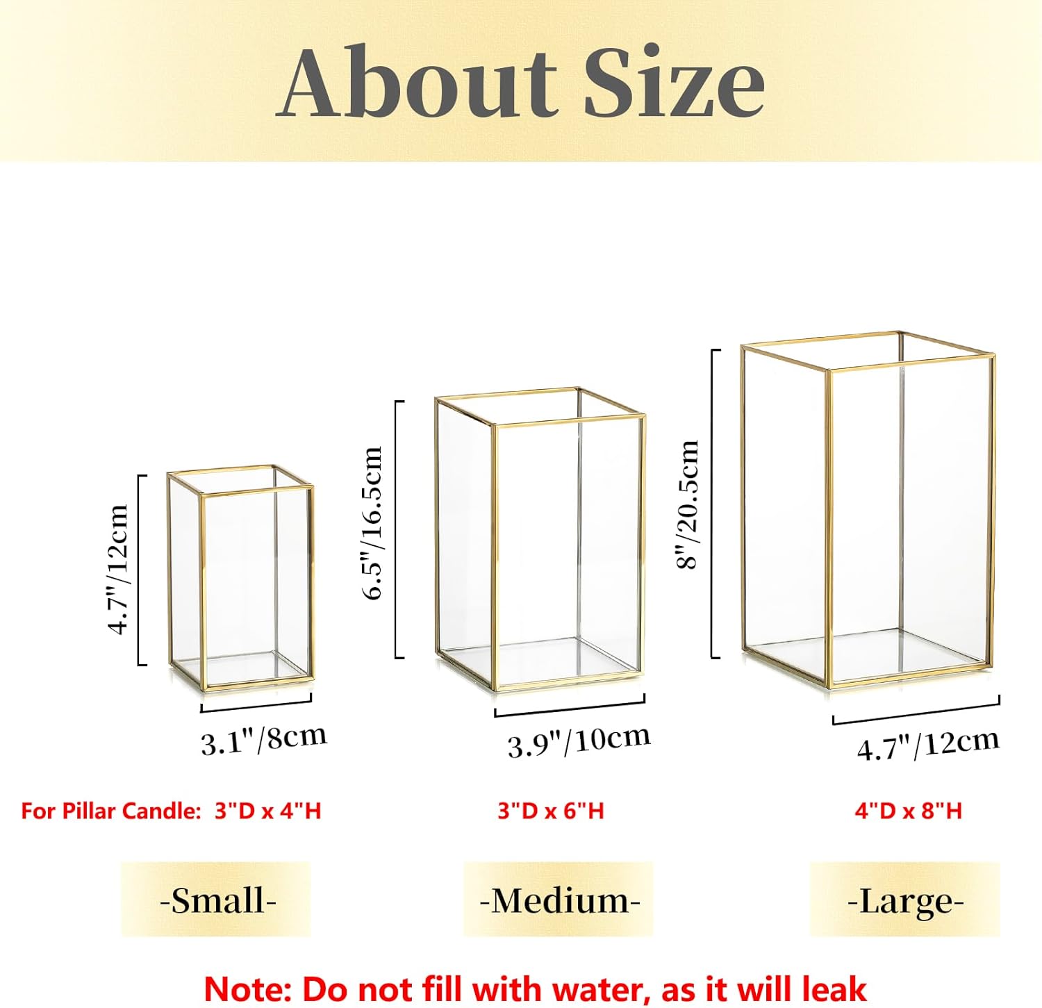 - 3 Different Sizes -- The square candle holders are 3 different sizes, which is so much more interesting to look at. They can meet your different needs. It can not only hold pillar candles, electronic candles or tea light candles, etc., but also some dried flowers, colored stones, fairy lights, makeup brushes or pencils.