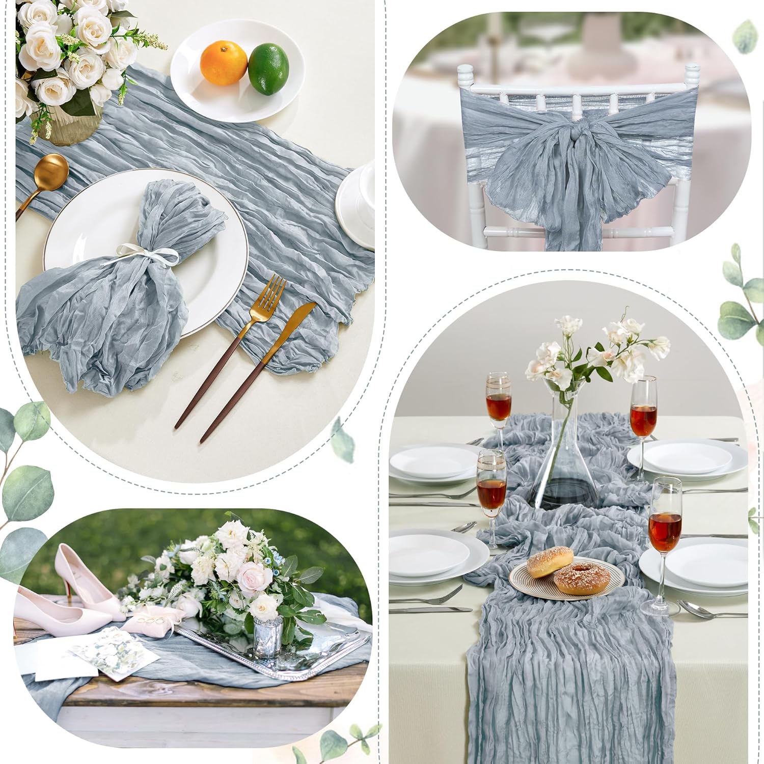 - PACKAGE INCLUDED: You will receive 12 pieces of dusty blue cheesecloth table runners. Elegant and beautiful design, exquisite workmanship. Product size: Each boho table runner is 35 x 120 inches. Enough to cover rectangles and round tables, as well as long tables that are stitched together. It can even be used to belt chairs decorate napkins, background curtains. Round or square tables for 8-10 people, perfect for romantic and elegant party events