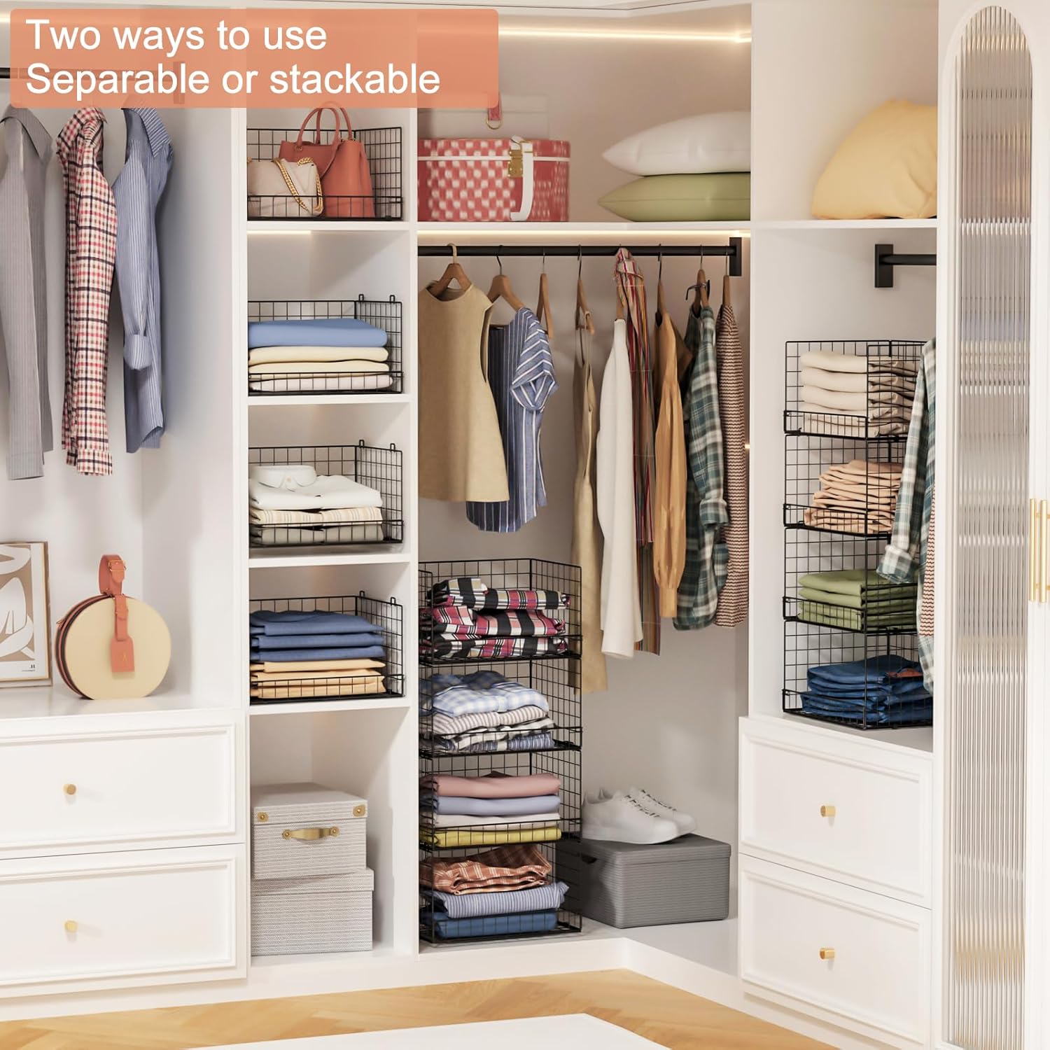 - 【Stackabe and Foldable】These collapsible closet shelves organizer are stackable and foldable.And can fold them to put in a corner without taking up space.You can stack multiple units together or use only one to meet your different needs.