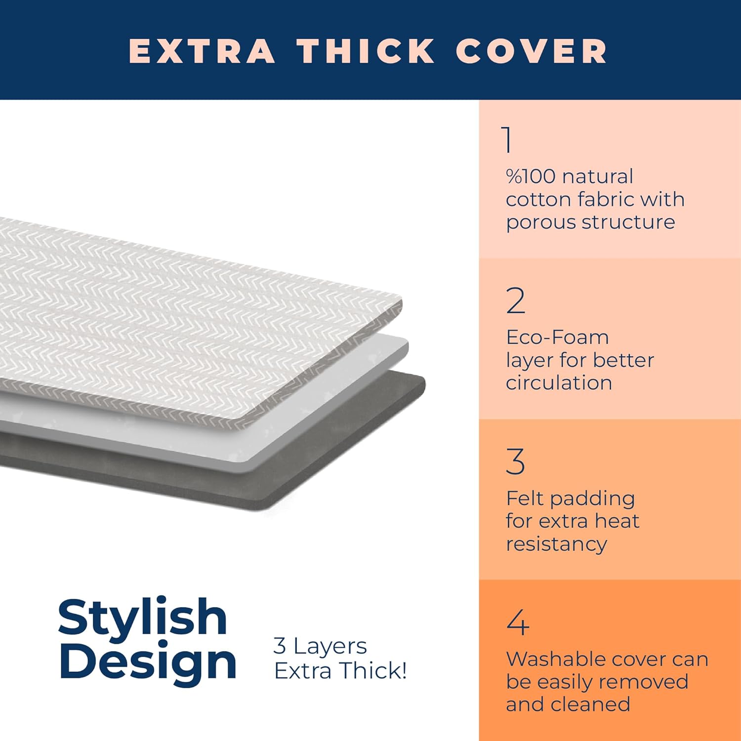 - EXTRA THICK PADDING FOR REMARKABLE DURABILITY: Heavy-duty padding and %100 cotton surface provides exceptional durability to ironing board cover. Top layer is extremely scorch and stain resistant cotton fabric. Happhom cover is specially designed to meet a contemporary taste. Our cover with exclusive patterns and design is a great fit to family d‚cor.