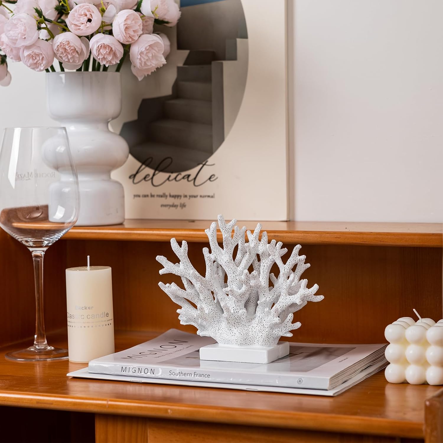 5.8" H White Coral Decor, Resin Coral Statue, Nautical Decorations for Home, Bedroom, Bathroom, Living Room, Beach/Coastal/Ocean Themed Cabinet Shelf Tabletop Decor