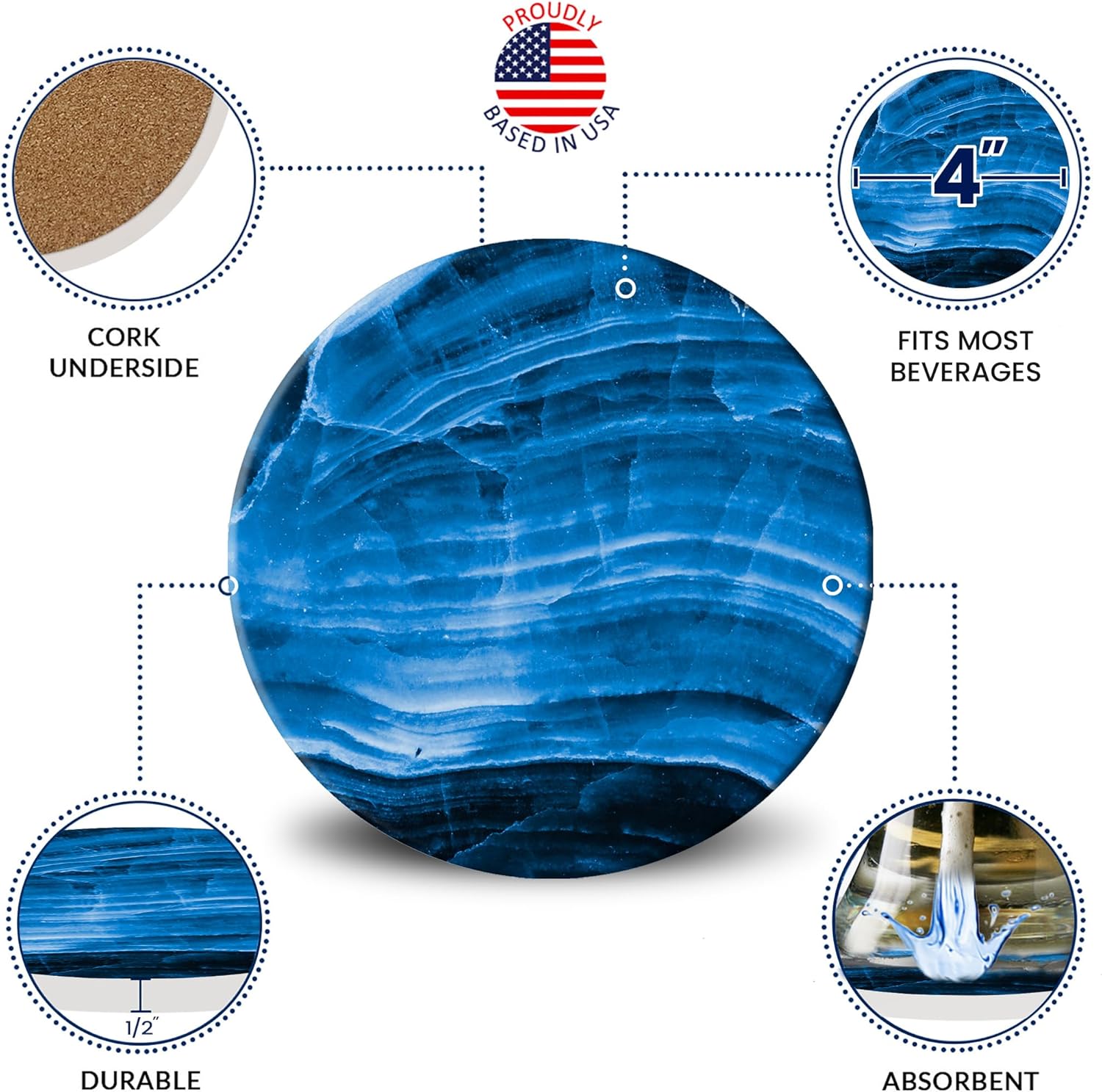 Emerson Coasters for Drinks Absorbent – Dining Table Set of 6 with Holder, 100% Ceramic Wooden Tabletop Protection Marble Style - Non Slip & Cork Bottom - Heavy Duty (Blue Stone)