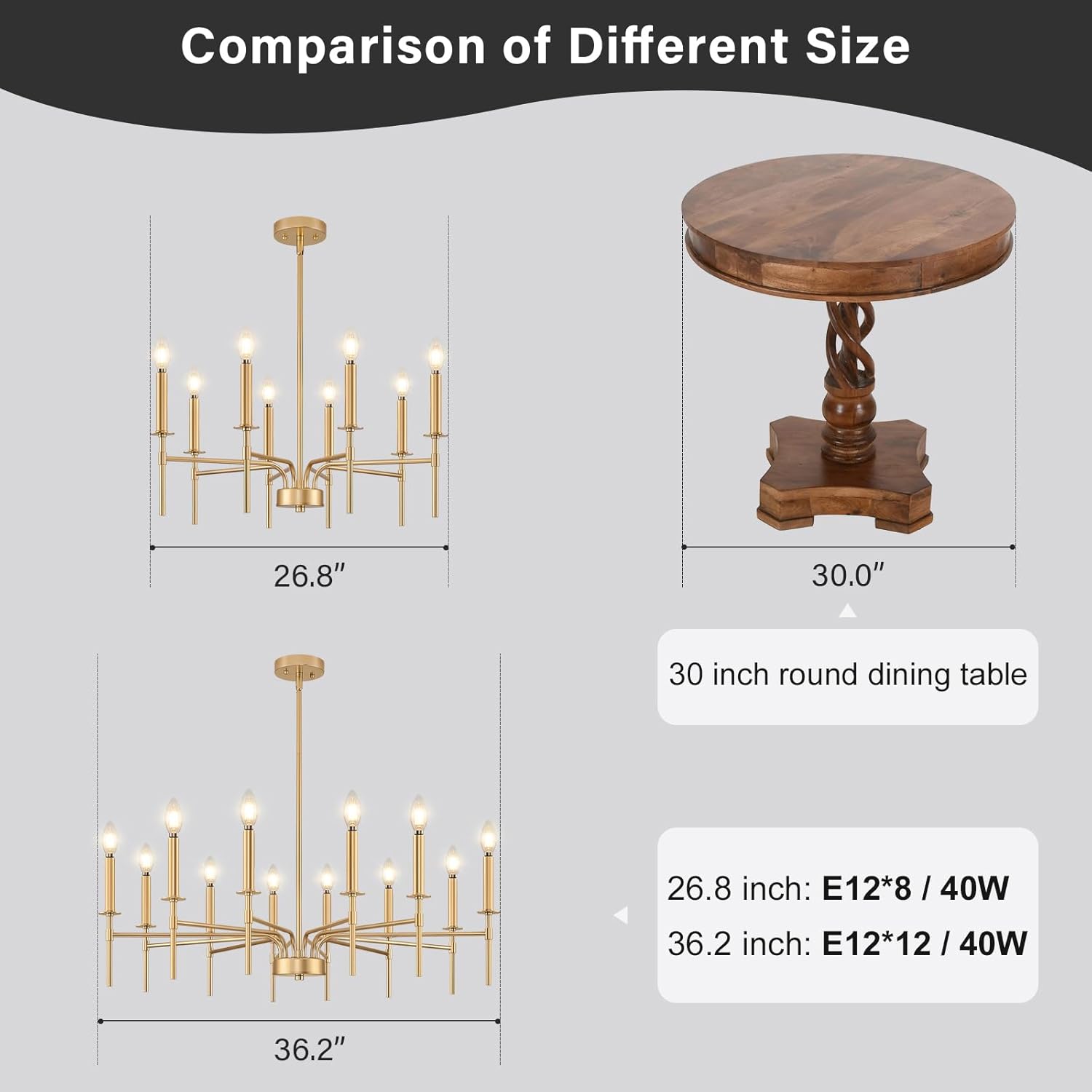 • Stylish and Widely Applicable: The 36.2-inch diameter of this large gold chandelier light fixture makes it a versatile addition to farmhouse, modern, mid-century, traditional, or contemporary spaces. It's an excellent choice for a foyer chandelier, a modern chandelier for foyer entryway, or as a statement piece in a gold dining room chandelier setting, and also ideal for a living room chandelier