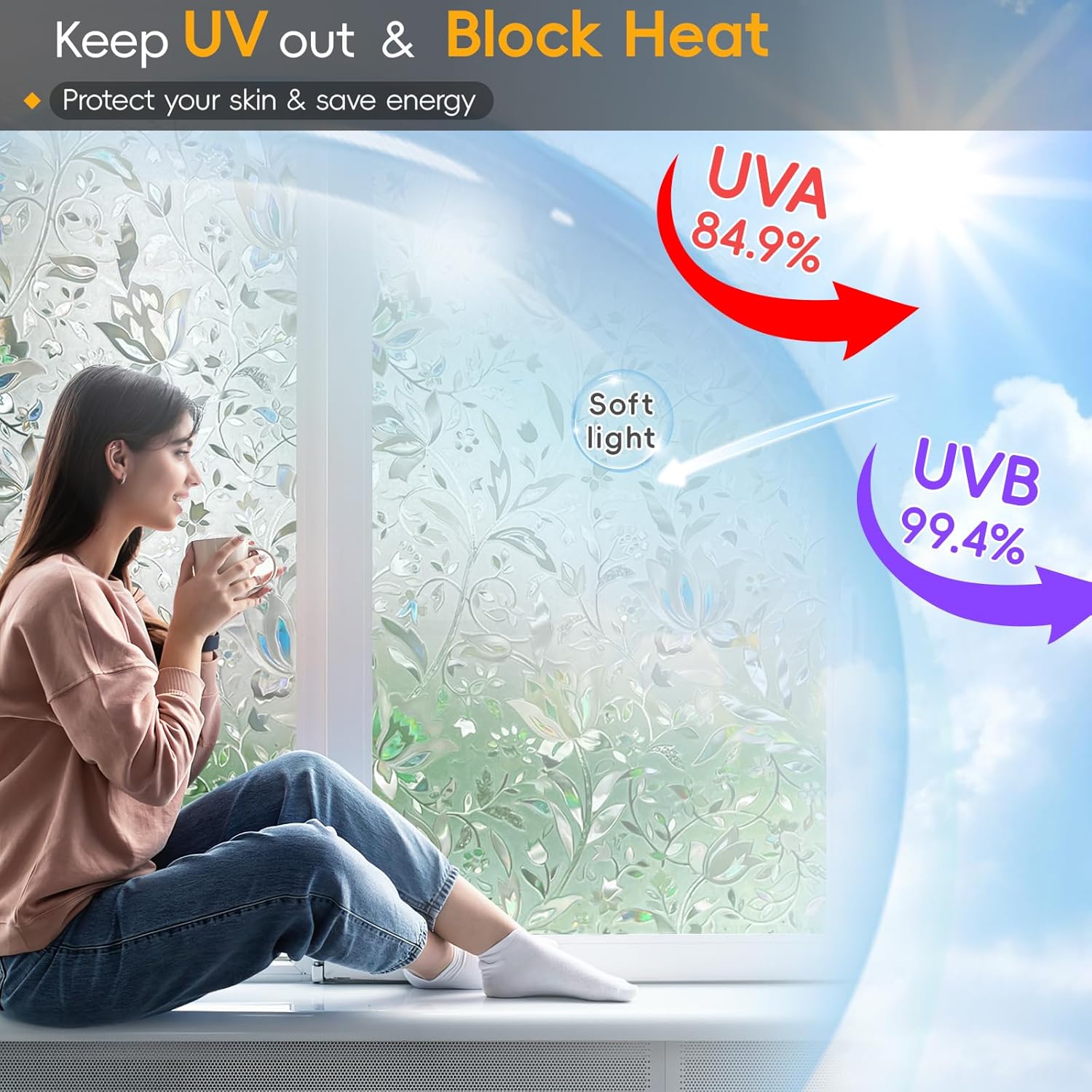 - UV Protection & Energy Saving: Window cling privacy film blocks up to 96% of uv rays. Suncatcher for window reduces most of glares, slowing down fading on flooring, furniture, and protect your beloved oneβs skin. Iridescent window film can also cut energy bill up to 50% by rejecting up to 50-90% of total solar energy.