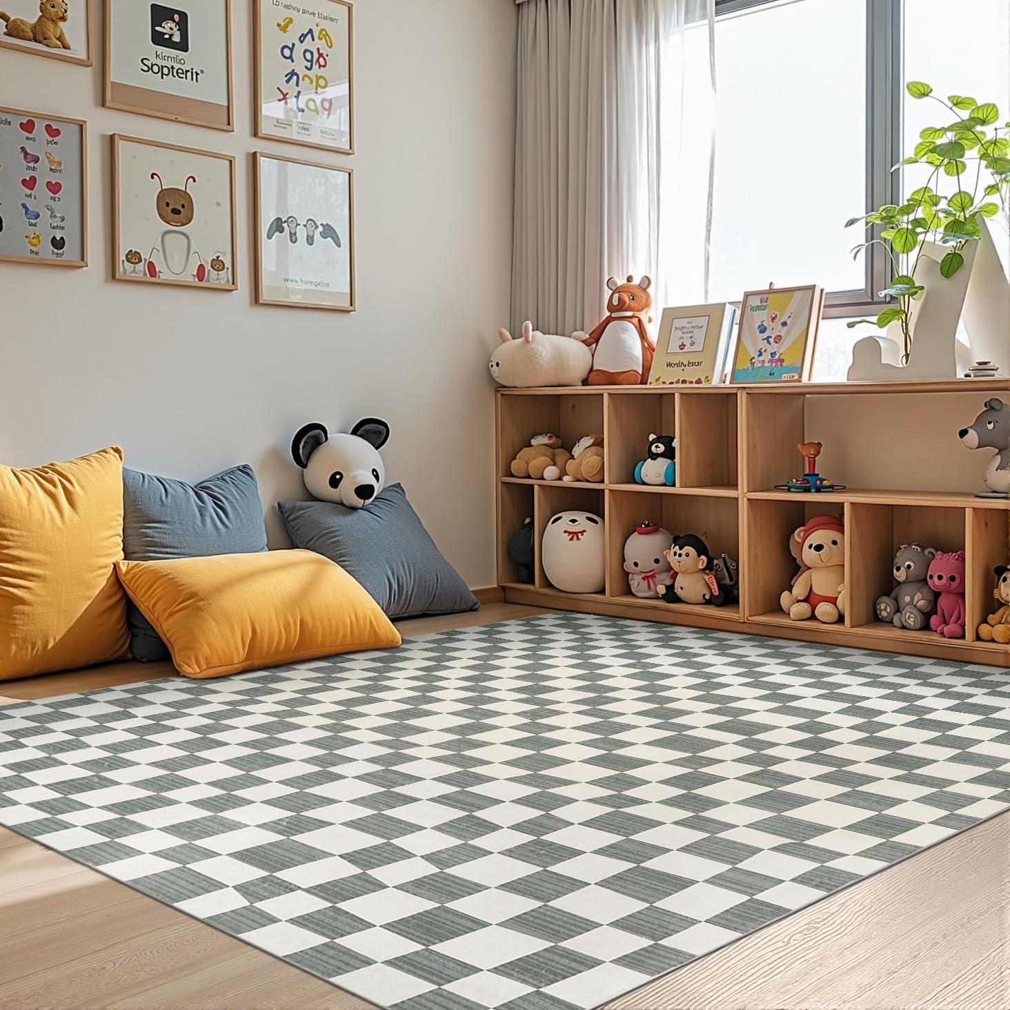 jinchan 5x7 Checkered Area Rugs for Kids Room - Machine Washable Soft Rug Modern Geometric Lattice Non-Slip Carpet for Nursery Playroom Classroom Living Room Bedroom Dining Room Home Office Grey
