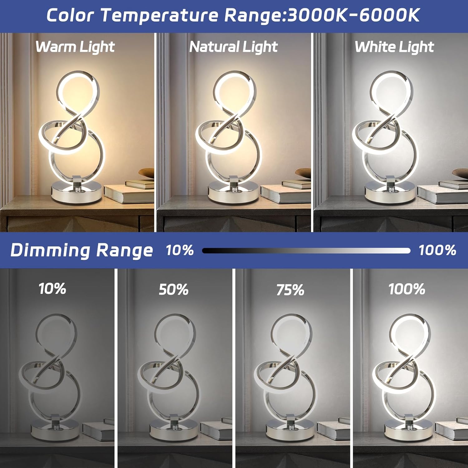 Modern Table Lamp, LED Bedside lamp with USB C+A Ports, Touch Stepless Dimmable Nightstand lamp, Unique Spiral Table lamp for Bedroom Living Room Home Office, LED Spiral lamp, Silver
