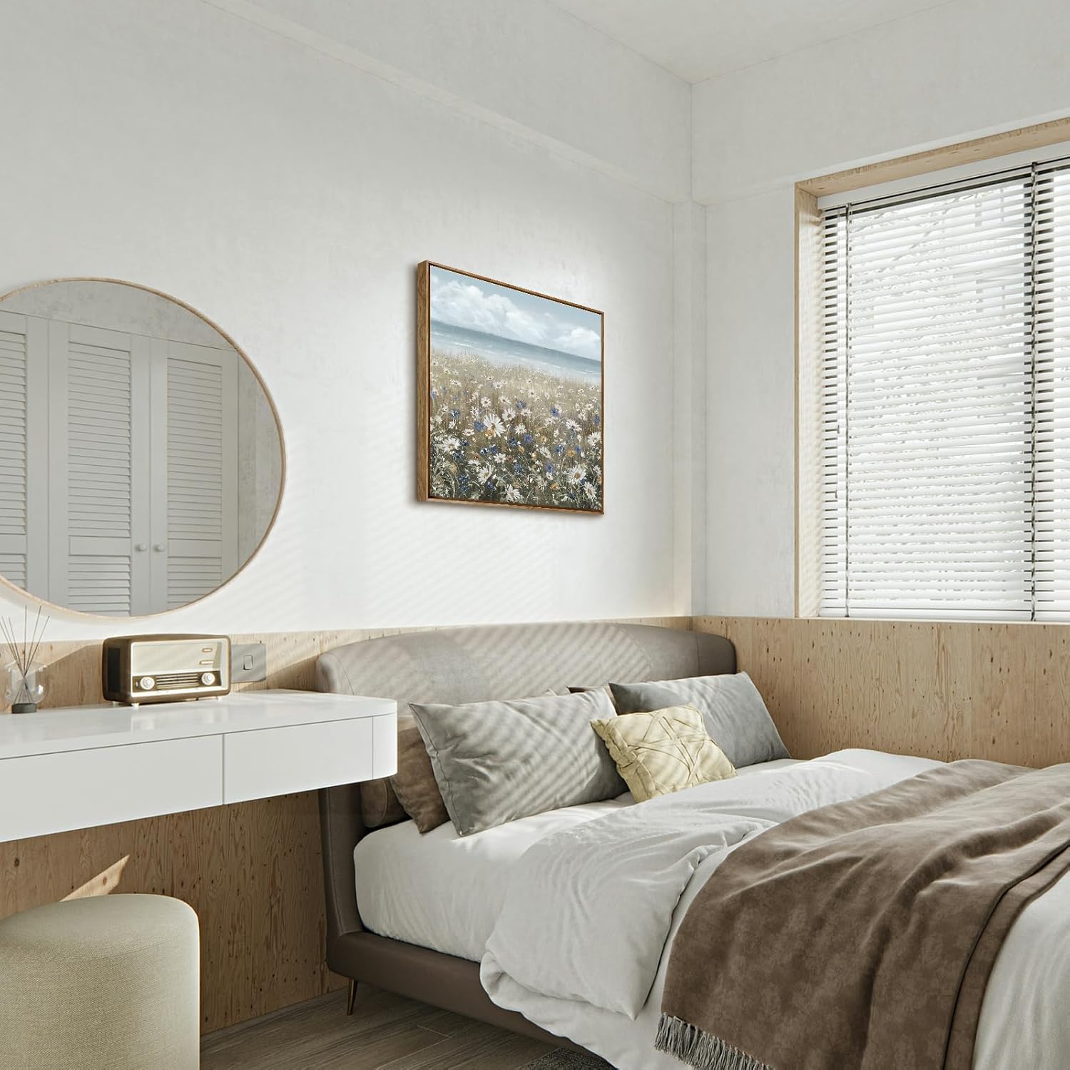 Framed Wall Art for Bedroom Decor Farmhouse Boho Beach Coastal Vintage Floral Ocean Wall Picture Daisy Flowers Sea Canvas Print Nautical Neutral Seascape Artwork for Home Living Room Bedroom Office