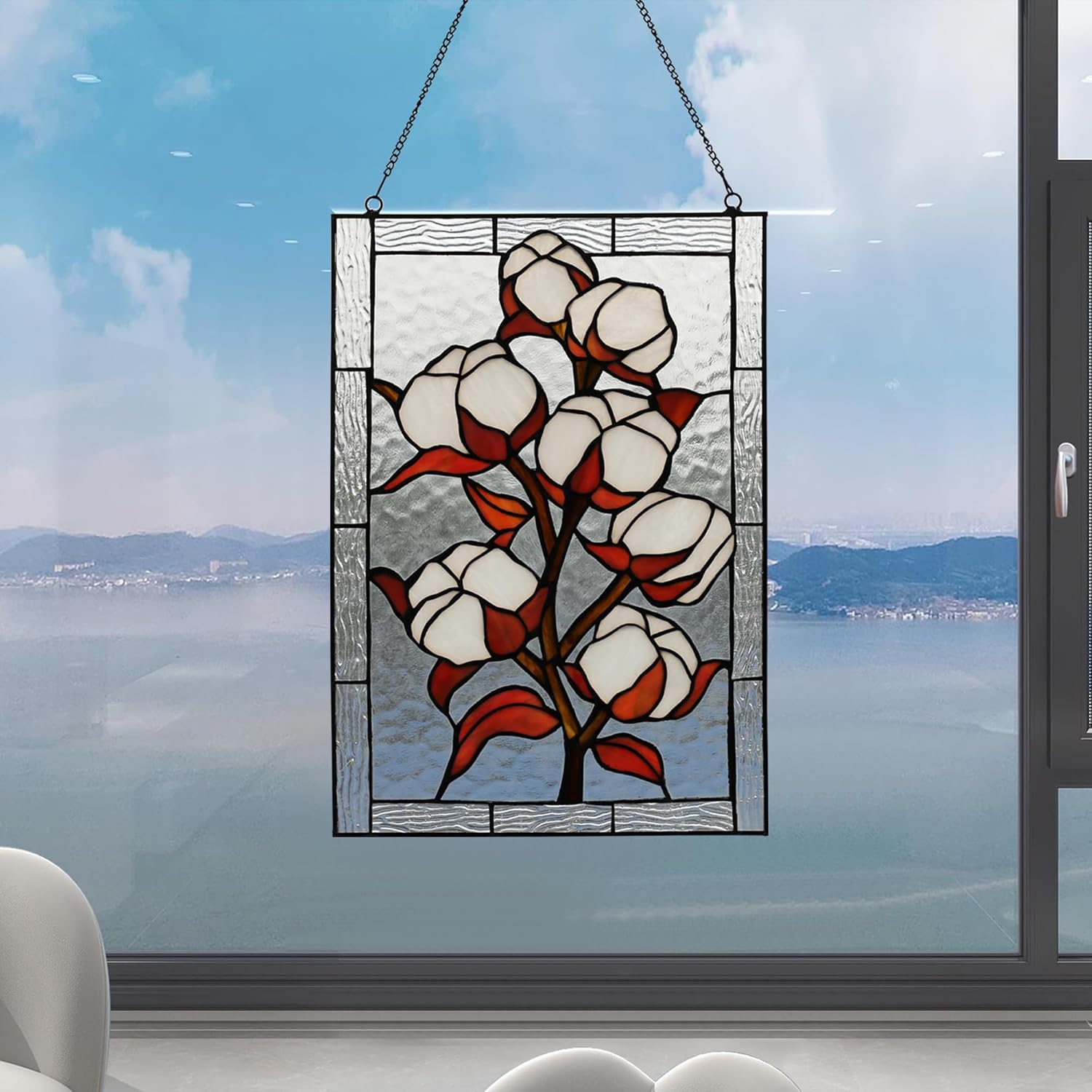 YOURANJU Stained Glass Window Hanging 16" H x 11" W Tiffany Style Rectangular Window Panel Suitable for Living Room Bedroom Kitchen Window Decoration Hangings with Chain (Plum bossom)