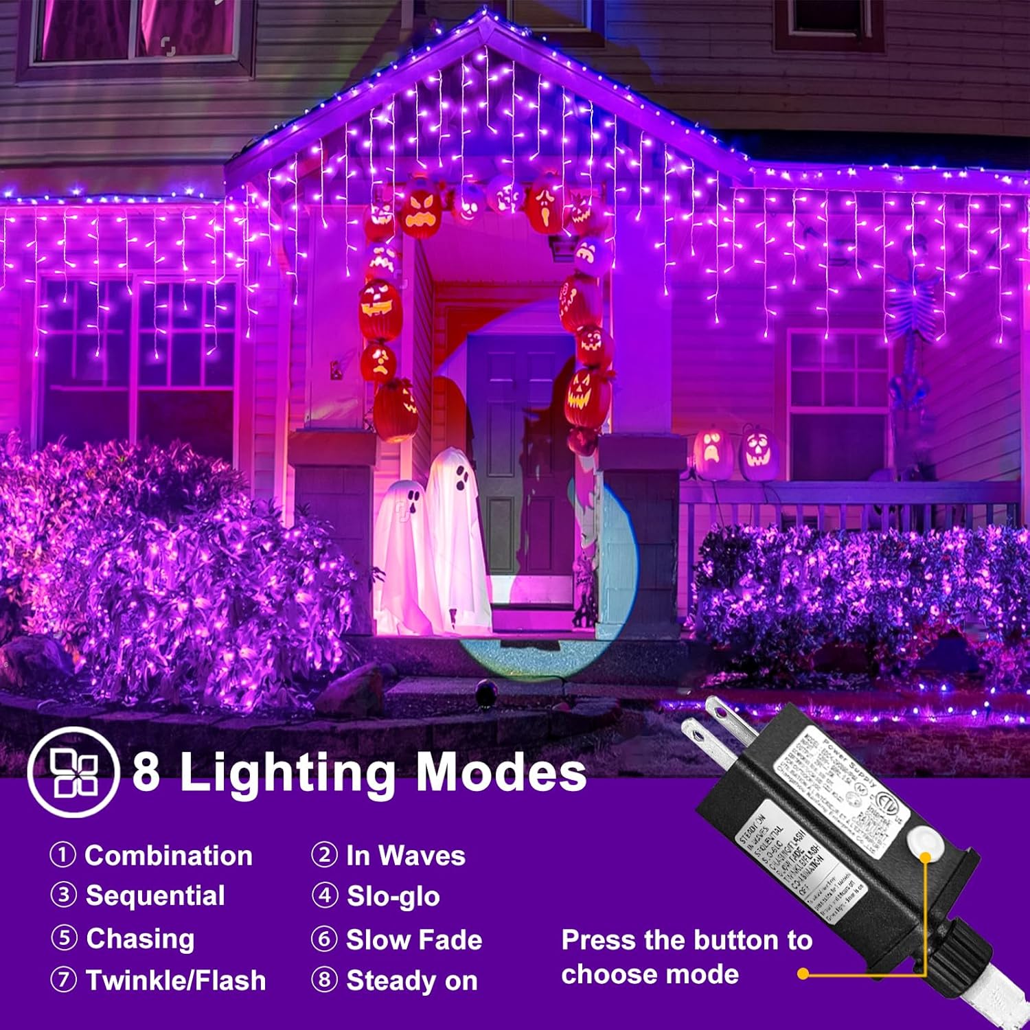 - Upgraded 8 Modes Halloween Lights: The icicle Lights have 8 selections of light pattern: 1.Combination 2.In Waves 3.Sequential 4.Slo-Glo 5.Chasing/Flash 6.Slow Fade 7.Twinkle/Flash 8.Steady On. Different lighting effects are controlled by the button on the plug. These beautiful and vibrant outdoor lights will bring you a lot of festive atmosphere.