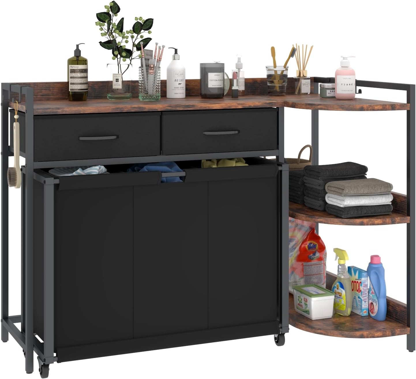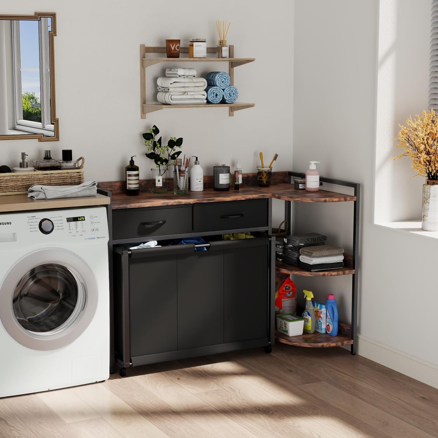 L Shaped Laundry Hamper Laundry Basket with 3 Section Pull-Out Rolling Bags & 3-Tier Storage Shelf, Laundry Sorter for Organization and Storage with 2 Drawers for Laundry Room
