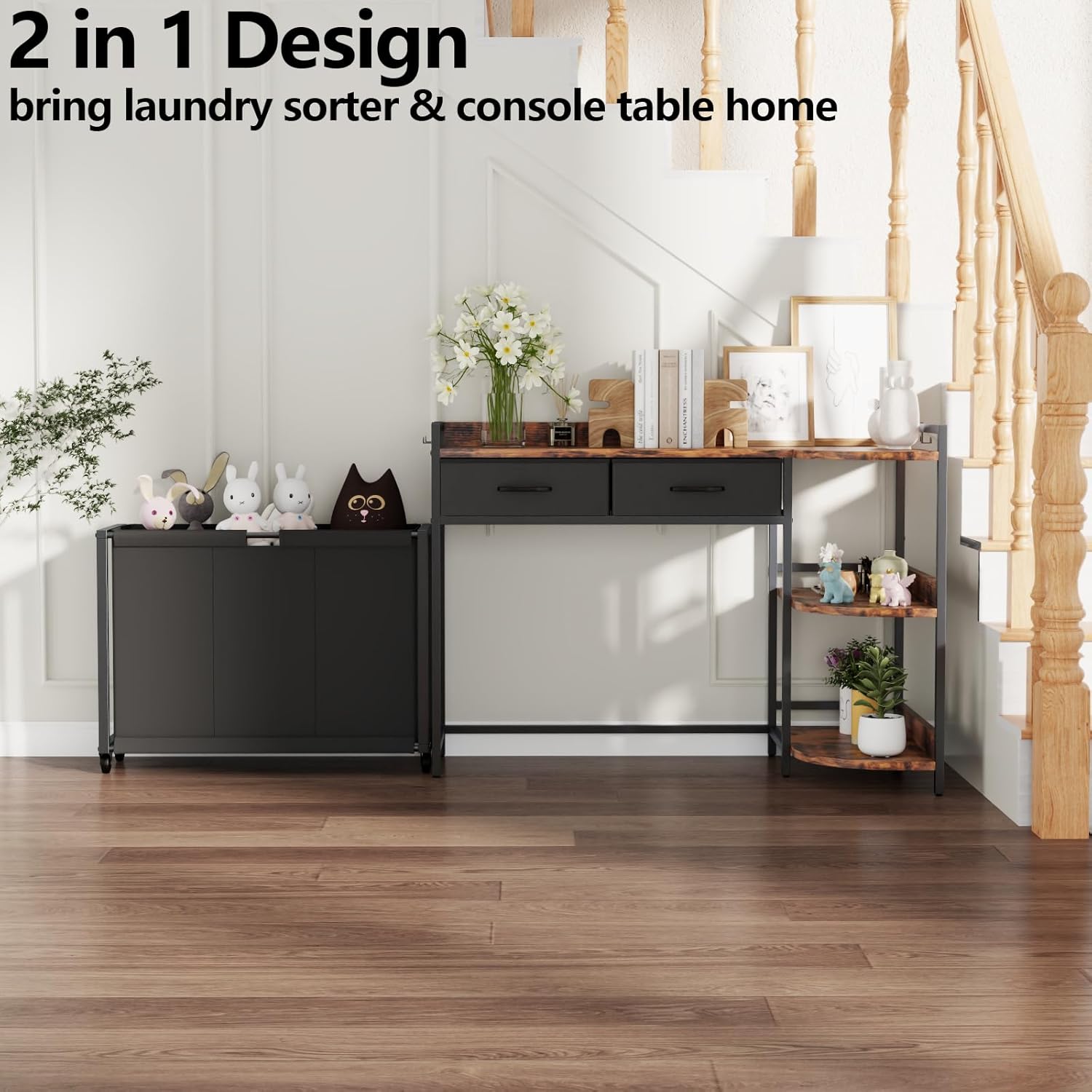 - [Easy Assemble & Reliable Construction] The entire laundry hamper consist of two pieces which are respectively console table with drawers and rolling laundry bags. Both of them utilized powder-coated steel tube as structure, especially the laundry basket choose round tube to reduce wear and tear on fabric. The package comes with clear assembly instructions and numbered parts, you will get a rolling laundry hamper in 30 Minutes.