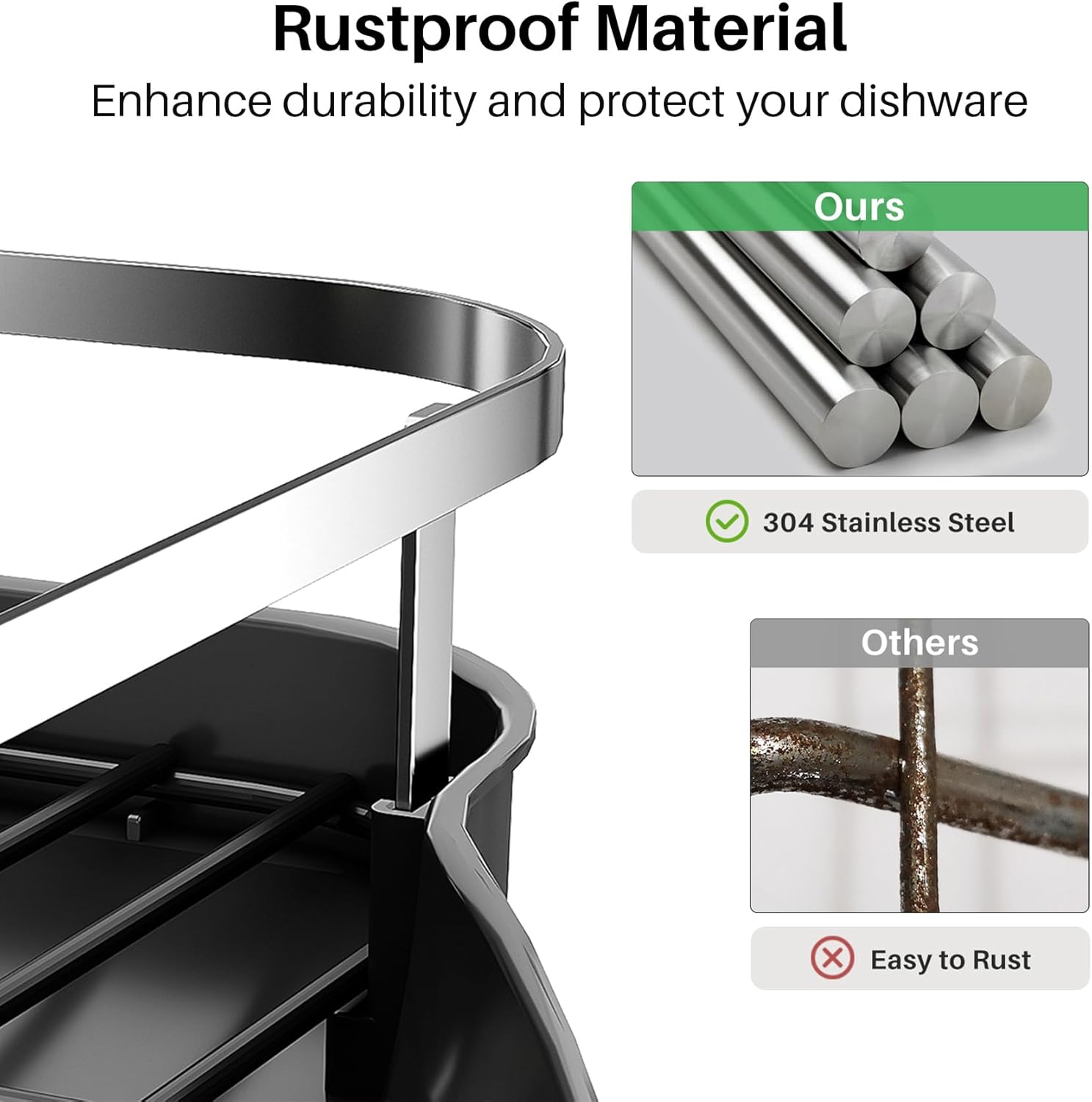 - Rustproof Material: Made of premium 304 stainless steel guardrail, black coated wire and anti-fingerprint PP drip tray, our dish drying rack is anti-rust and anti-deformation, while the rubber coated feet ensure it stays in place without scratching your countertop.