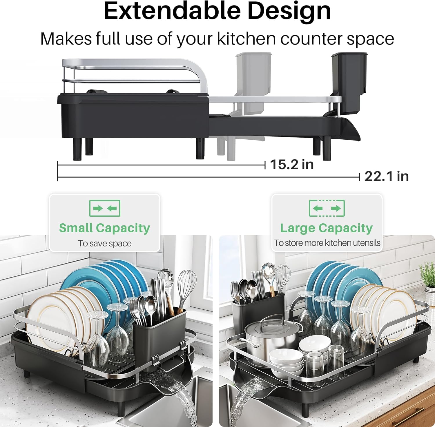 - Extendable Design: SNTD's dish drying rack measures 12.8" D x 4.7" H, and the width can be adjusted from 15.2" to 22.1", which is suitable for kitchens with limited space. The rack can be extended or retracted to fit your available counter, while it is capable of accommodating 10 plates, 6 bowls and glasses.