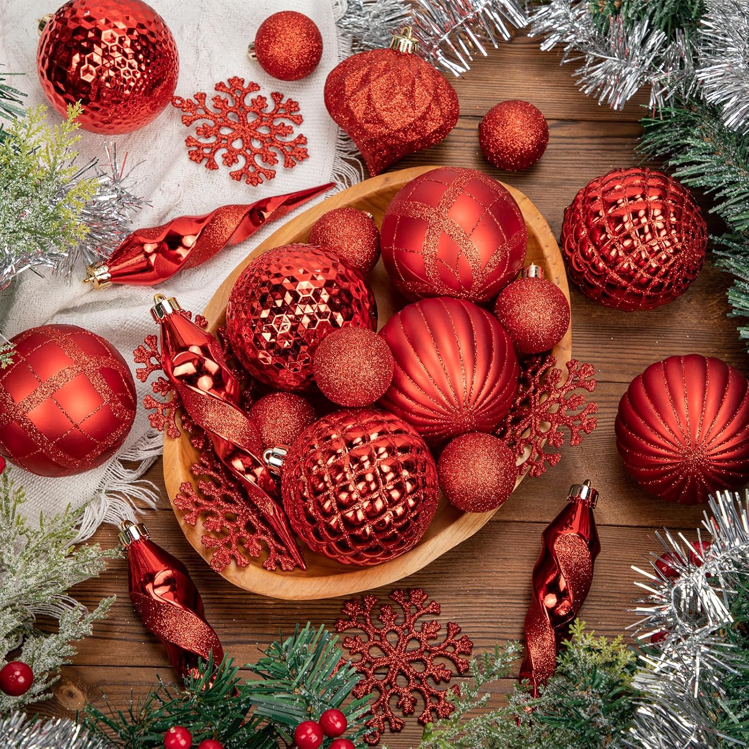 - VARIETY OF SHAPES AND SIZES FOR A PERFECT HOLIDAY LOOK β The set features a mix of 3.1-inch (8 cm) Christmas balls, 5.9-inch (15 cm) icicle ornaments, 1.6-inch (4 cm) glitter balls, and snowflake ornaments. This variety provides dimension and visual interest to your Christmas tree, garlands, wreaths, or holiday displays, ensuring a cohesive and polished appearance for your home