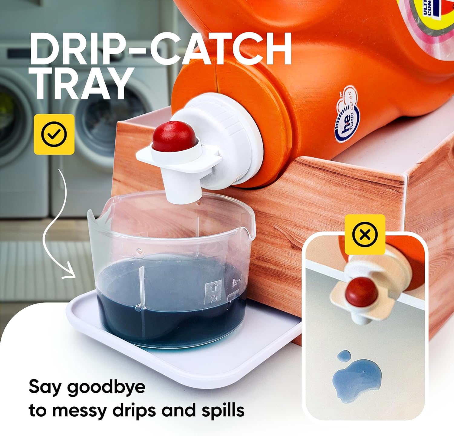 - Patents Pending Angled laundry detergent drip catcher, no need to tilt or lift the bottle. Downward slope makes soap pour out easily