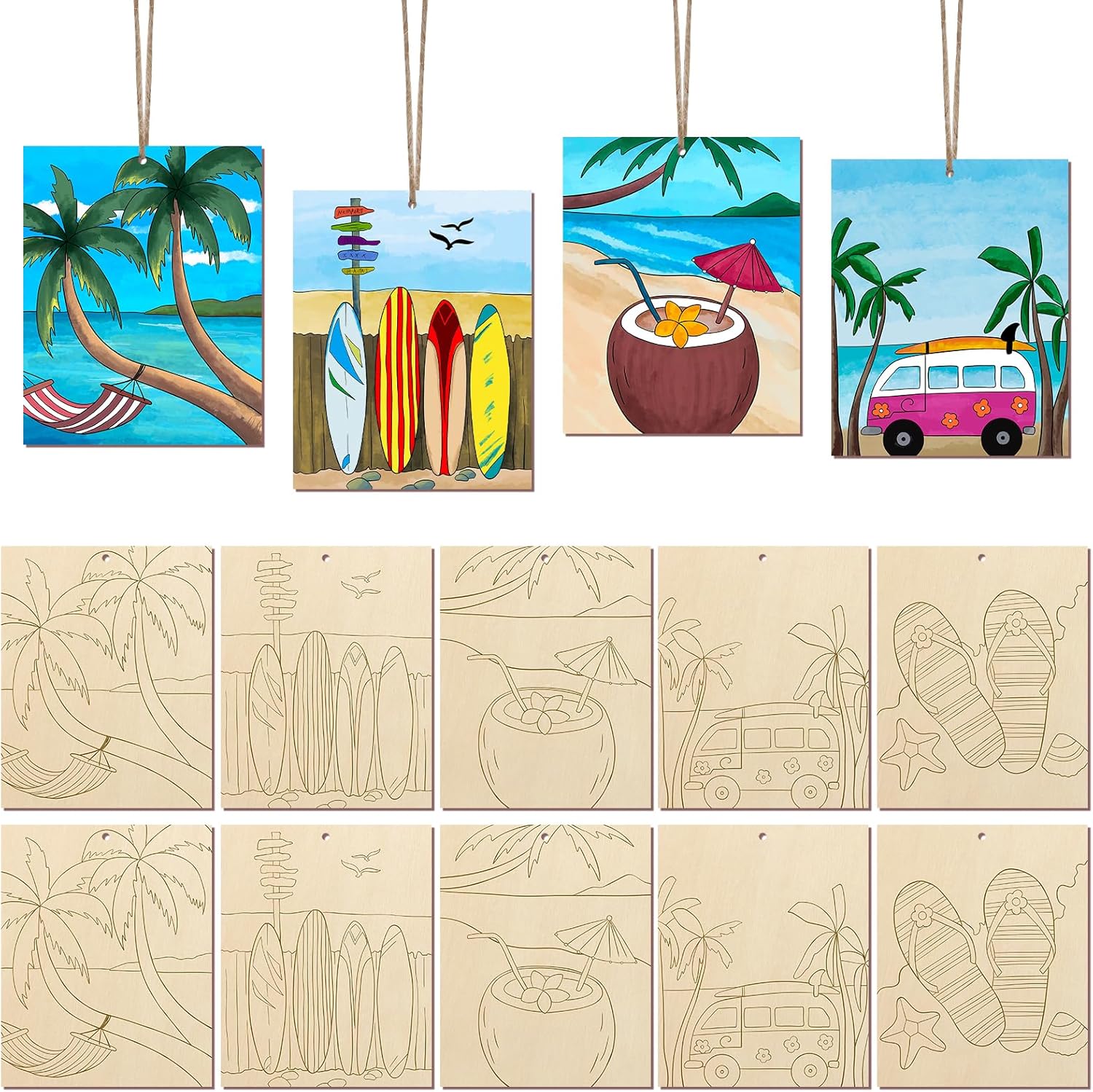 COCHIE 10 Pieces Large Summer Unfinished Wood Crafts to Paint for Adults and Kids, Bulk Predrilled Wooden Ornaments for Painting, Beach Paintable Wood Slices Craft Supplies with Ropes