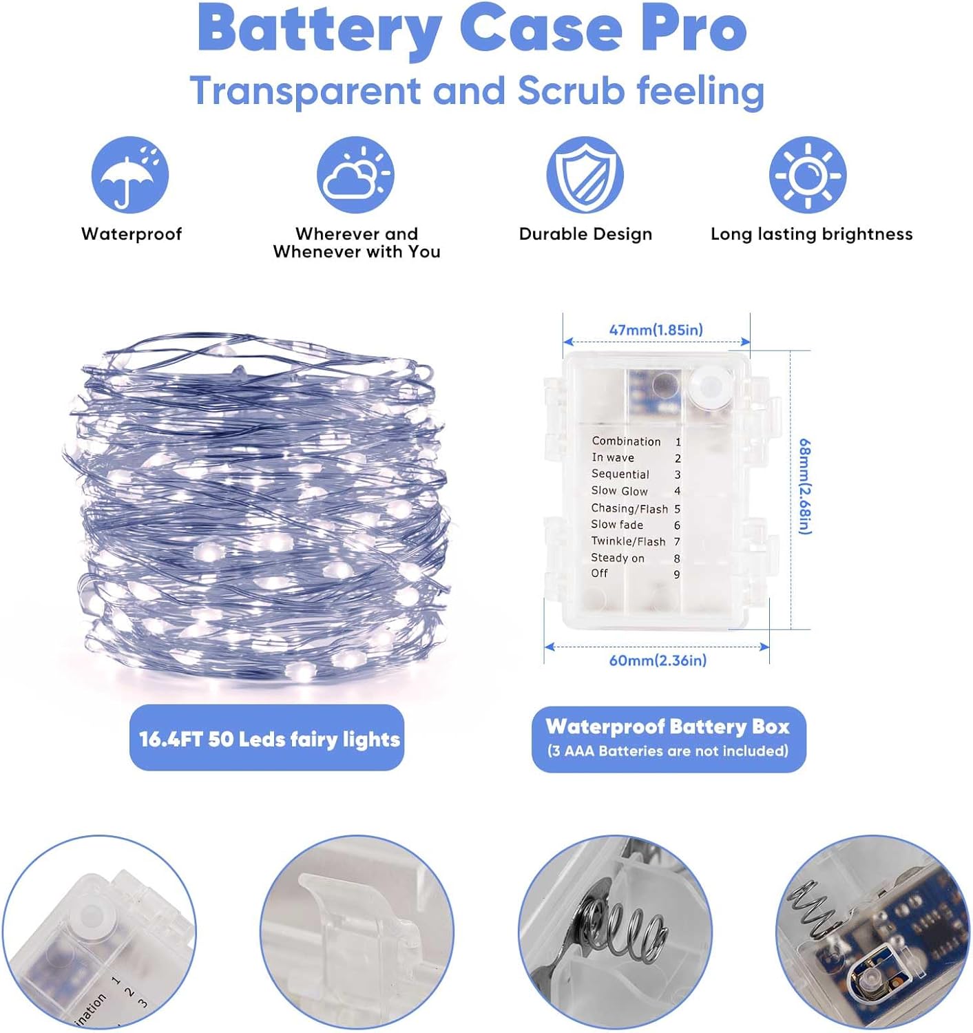 4 Pack 16.4 Ft. Battery Operated Outdoor String Lights with Remote & Timer, LED Cool White Fairy Lights, Waterproof Twinkle Lights for Bedroom, Dorm, Mason Jar, Wedding, Party, Christmas