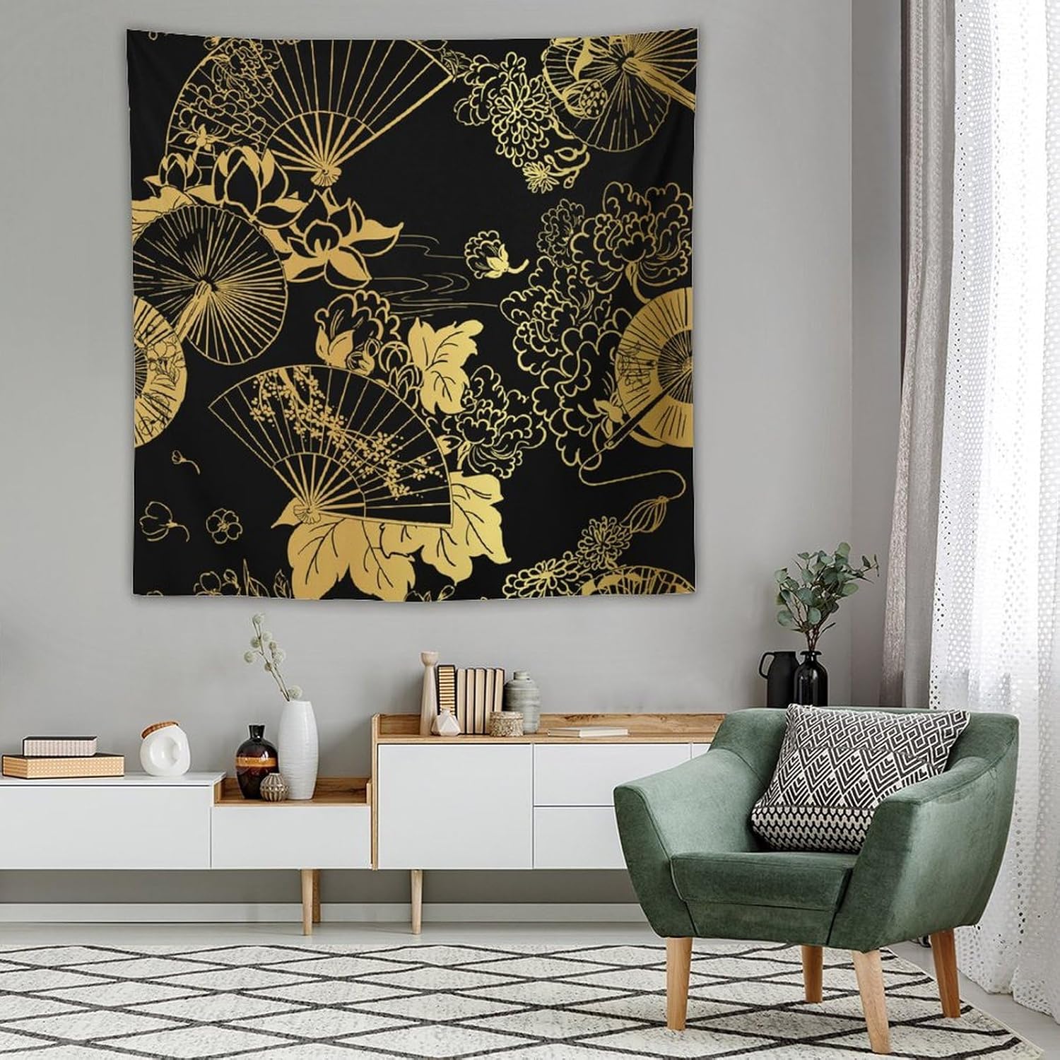 HZOHNAGO Japanese Tapestry Gold Flowers Umbrella Fan Pattern Printed Wall Tapestry Painting Wall Hanging for Bedroom Living Room Dorm 60" W x 60" H