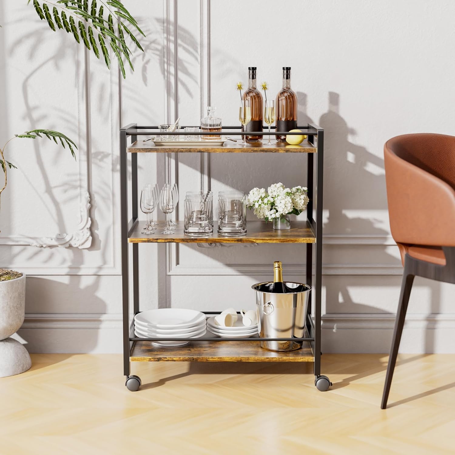 - VERSATILE SERVICE CART - With its modern and elegant style, this home bar cart can serve as a mobile coffee cart, microwave stand cart, kitchen utility cart, beverage cart, drink cart, liquor cart, wine cart, make an accent statement in your entryway, kitchen, living room or office room with a decorative