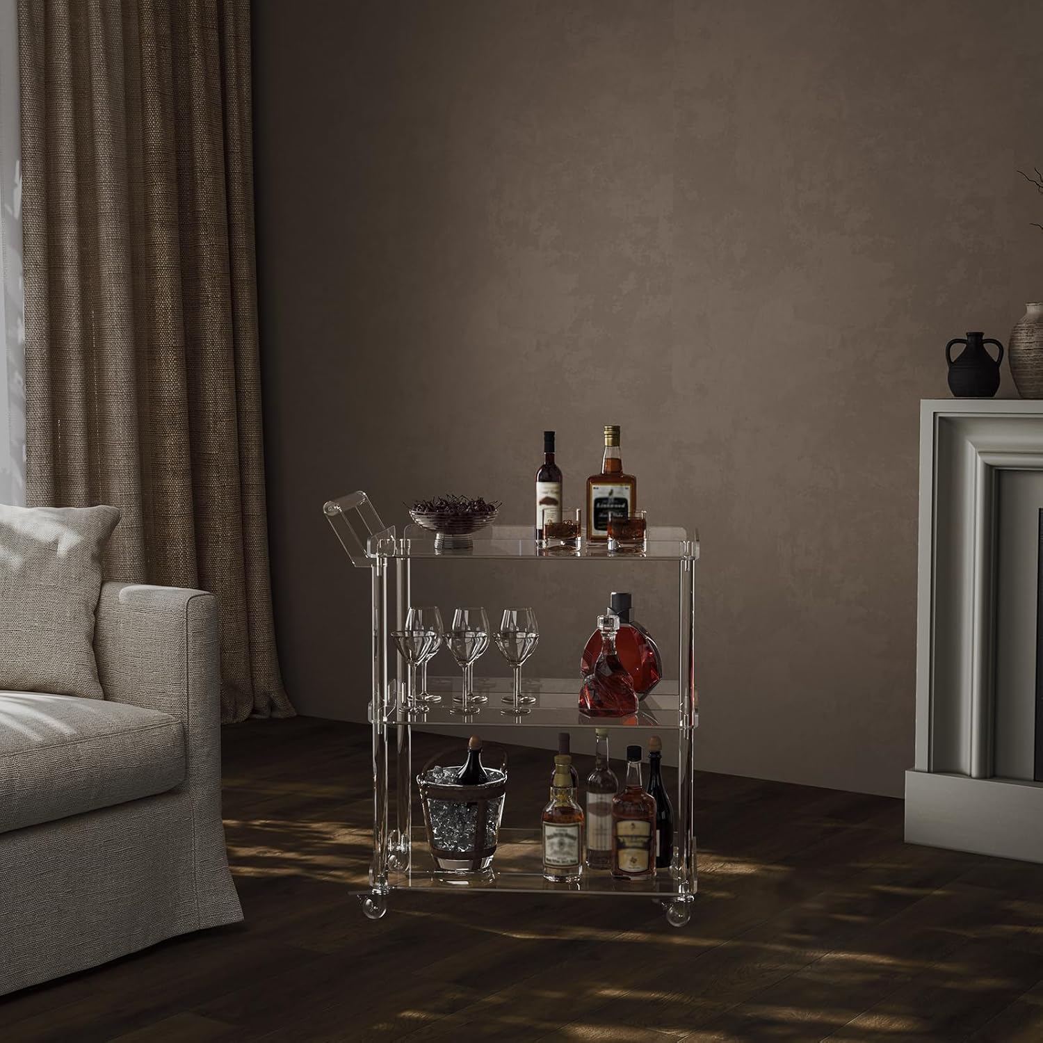 HMYHUM Acrylic Bar Cart with 4 Lockable Wheels, 30.5" L x 15.2" W x 34.5" H, Rolling Serving Cart for The Home Bar, Kitchen, Living Room, with Pulling Handle, Modern, 3-Tier, Clear