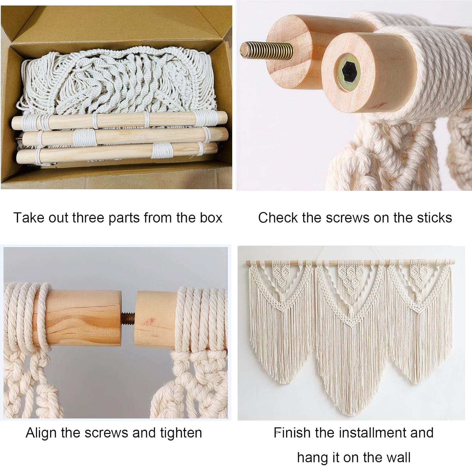 - Easy to Install: The package comes with 3 separate parts of short macrame wall hangings which could be easily connected together with the screws inserted in the wood rod.