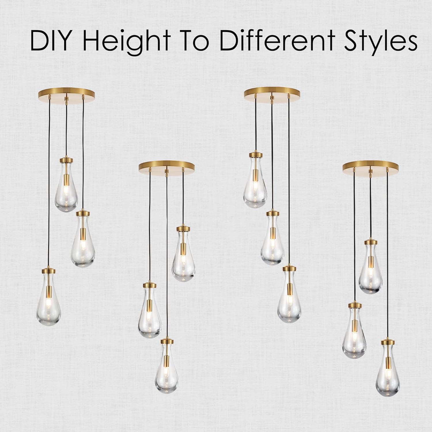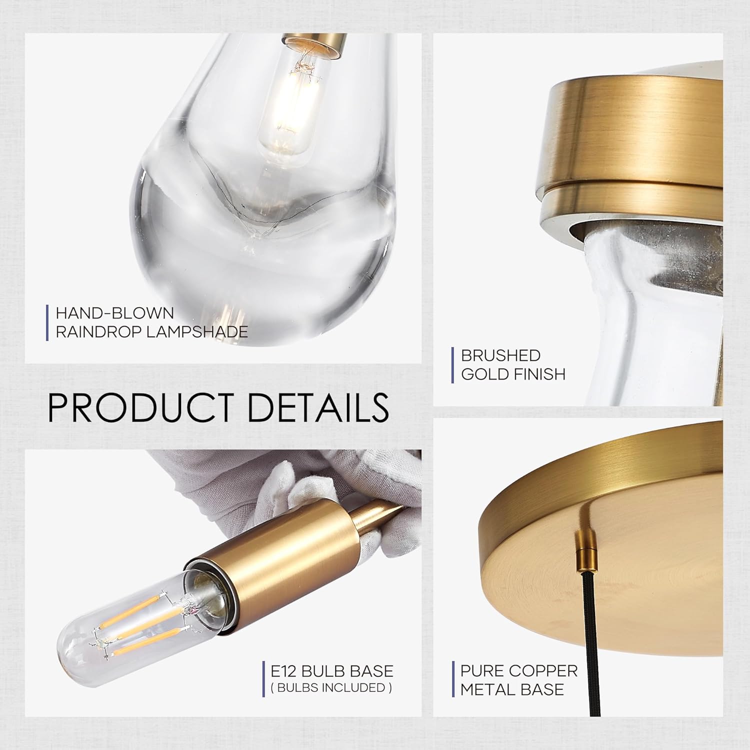 3-Light Raindrop Pendant Light Fixtures, Brass Glass Pendant Lighting, Teardrops Modern Hanging Light for Entryway Foyer Kitchen Island Dining Living Room Hallway