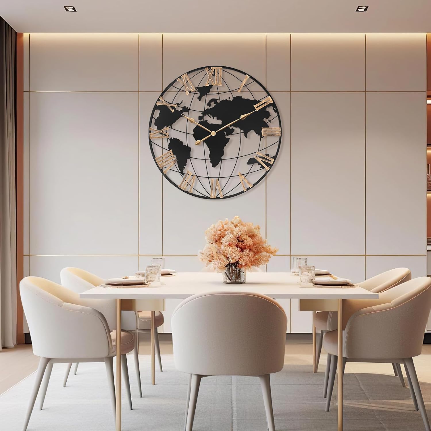 - 【Ideal Wall Decoration】The large metal farmhouse world map wall clock definitely draws attention on the wall and stands out:If you wanted to get a more big modern decorative wall clock for the new style decor,It's a wonderful addition to your living room fireplace,kitchen, dining room, bedroom, above your TV or anywhere: People stop to watch the industrial world map clock and comment on the clocks novelty.