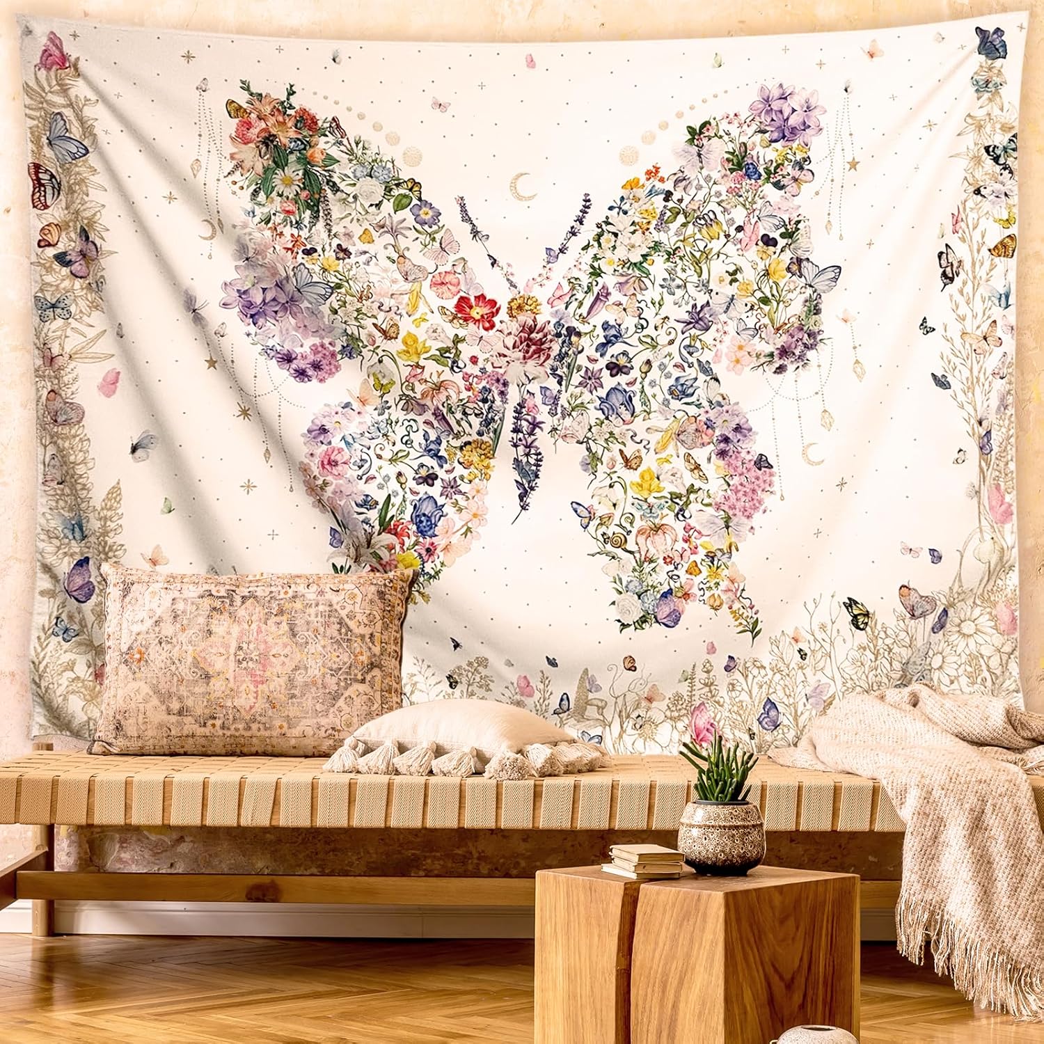 Damanse Butterfly Tapestry Wall Hanging Cute,Boho Wall Tapestry for Bedroom Aesthetic,Flower Living Room Decor for Teen Girls (White, 49.20" x 59.10")