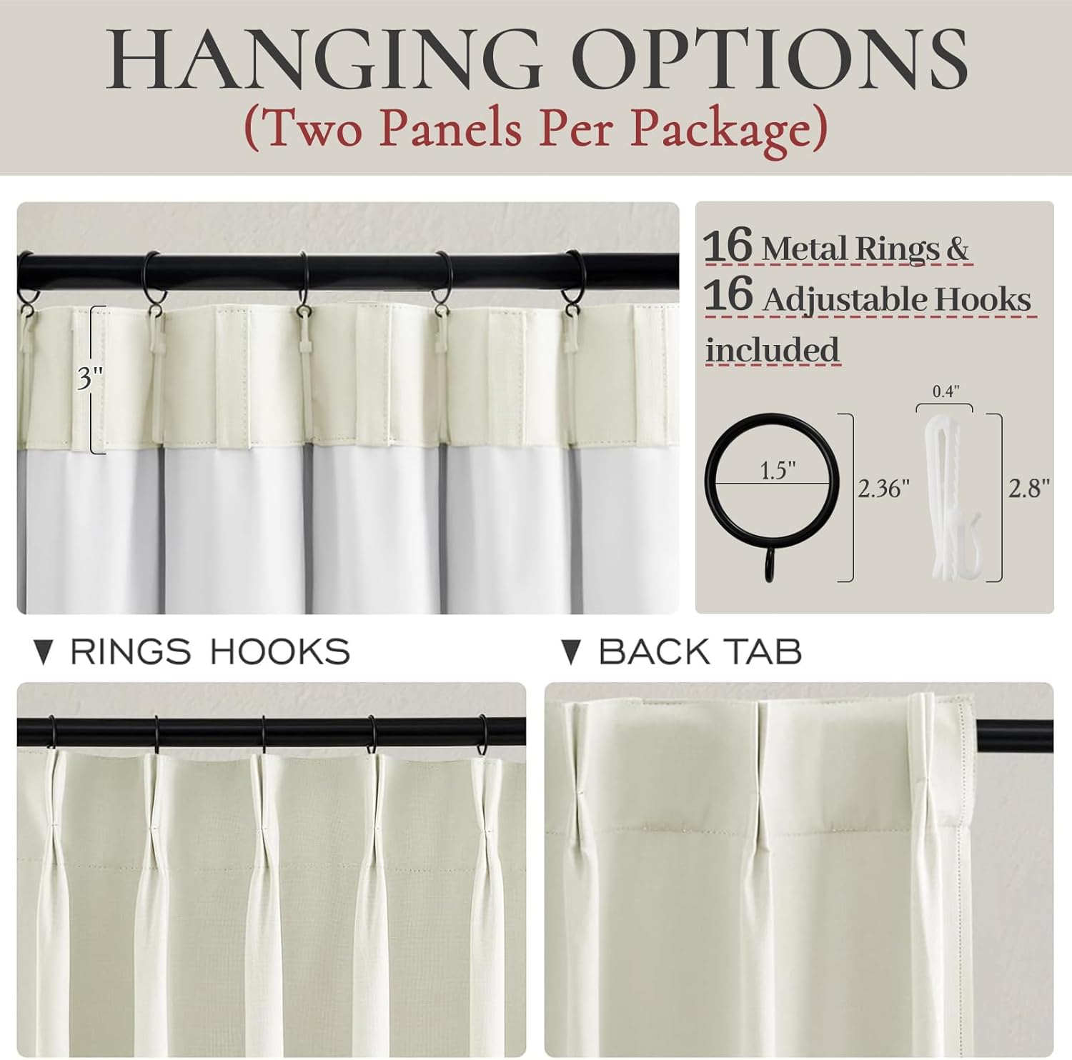 - Ready Made:Set of 2 pinch pleated curtain panels per package with 16 metal rings and 16 adjustable plastic hooks(The adjustable hook can raise and lower the height of the curtain by 1 inch),Each panel measures 40"W x 84"L,pair measures 80"W x 84"L