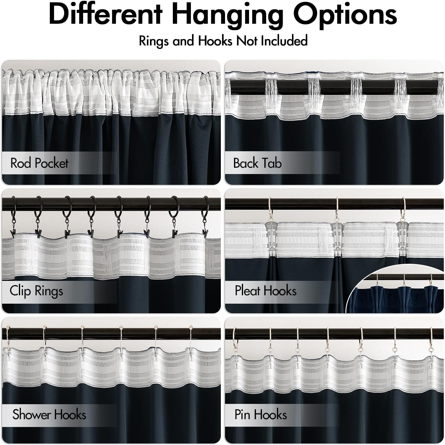 - HANGING OPTIONS: Each curtain panel has 3-in-1 top style design: rod pocket, back tab and pinch pleat. Back loop (2.3 inch) and rod pocket (3.1 inch) fit most standard rod. Curtains also can be hung with clip rings or curtain hooks. 3 ways to meet your various needs.