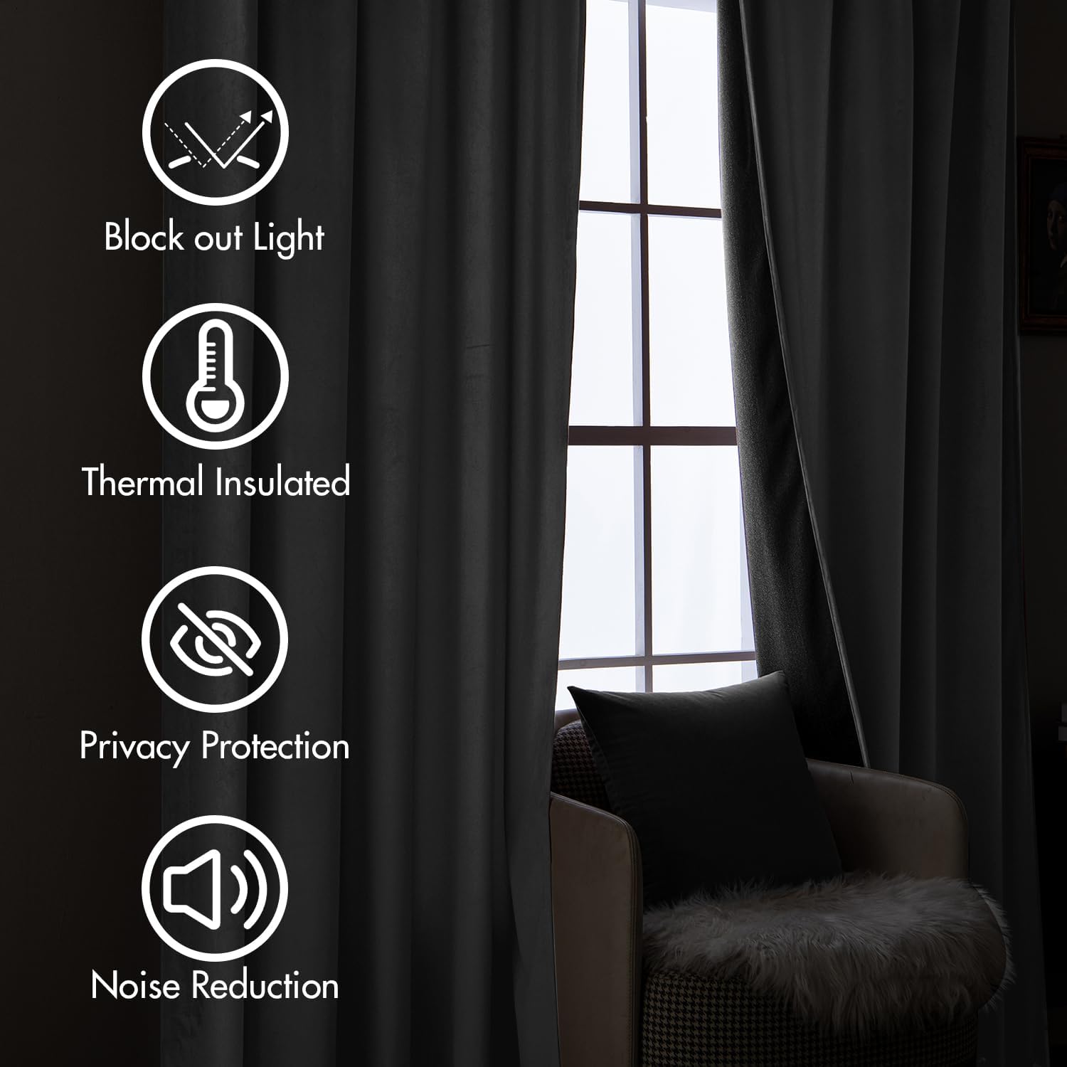 - FUNCTION: Craft from thick velvet, curtains can block 80% of the sunlight. Also, these drapes can keep heat down in summer or keep cold out in winter to achieve smart energy saving. And these panels can provide privacy, reduce noise, which help to create a quiet sleeping environment.