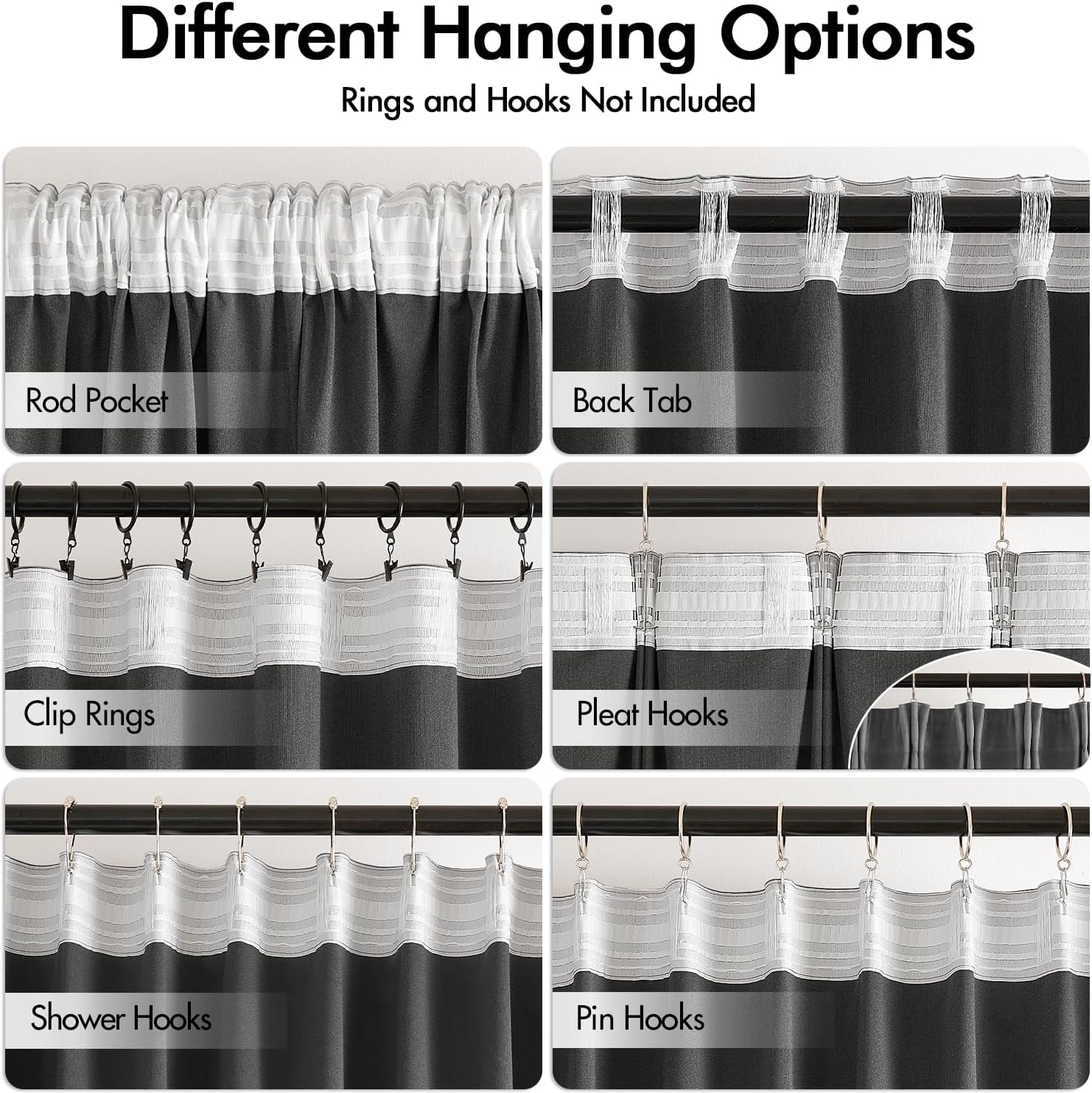 - HANGING OPTIONS: Each curtain panel has 3-in-1 top style design: rod pocket, back tab and pinch pleat. Back loop (2.3 inch) and rod pocket (3.1 inch) fit most standard rod. Curtains also can be hung with clip rings or curtain hooks. 3 ways to meet your various needs.