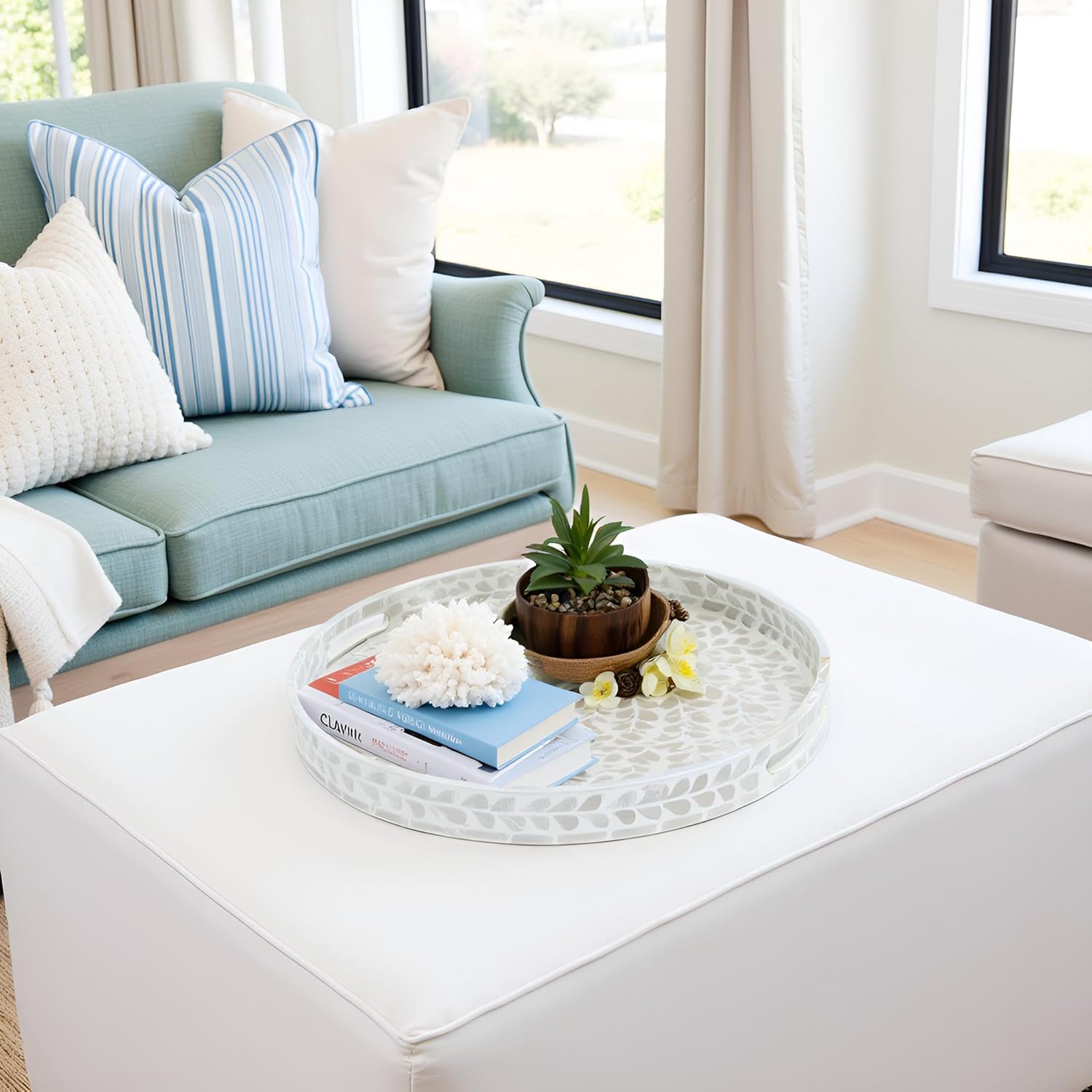 - White STYLISH FLORAL TRAYS with the great workmanship by Vietnamese artisans, flawlessly finished with strong wood core and blue floral pattern well-sorted MOTHER OF PEARL SHELLS inlayed on the surface creates an elegant handmade centerpiece to brighten your decoration, best matches any beach/coastal nauticaNew Home Gifts For Homel theme.