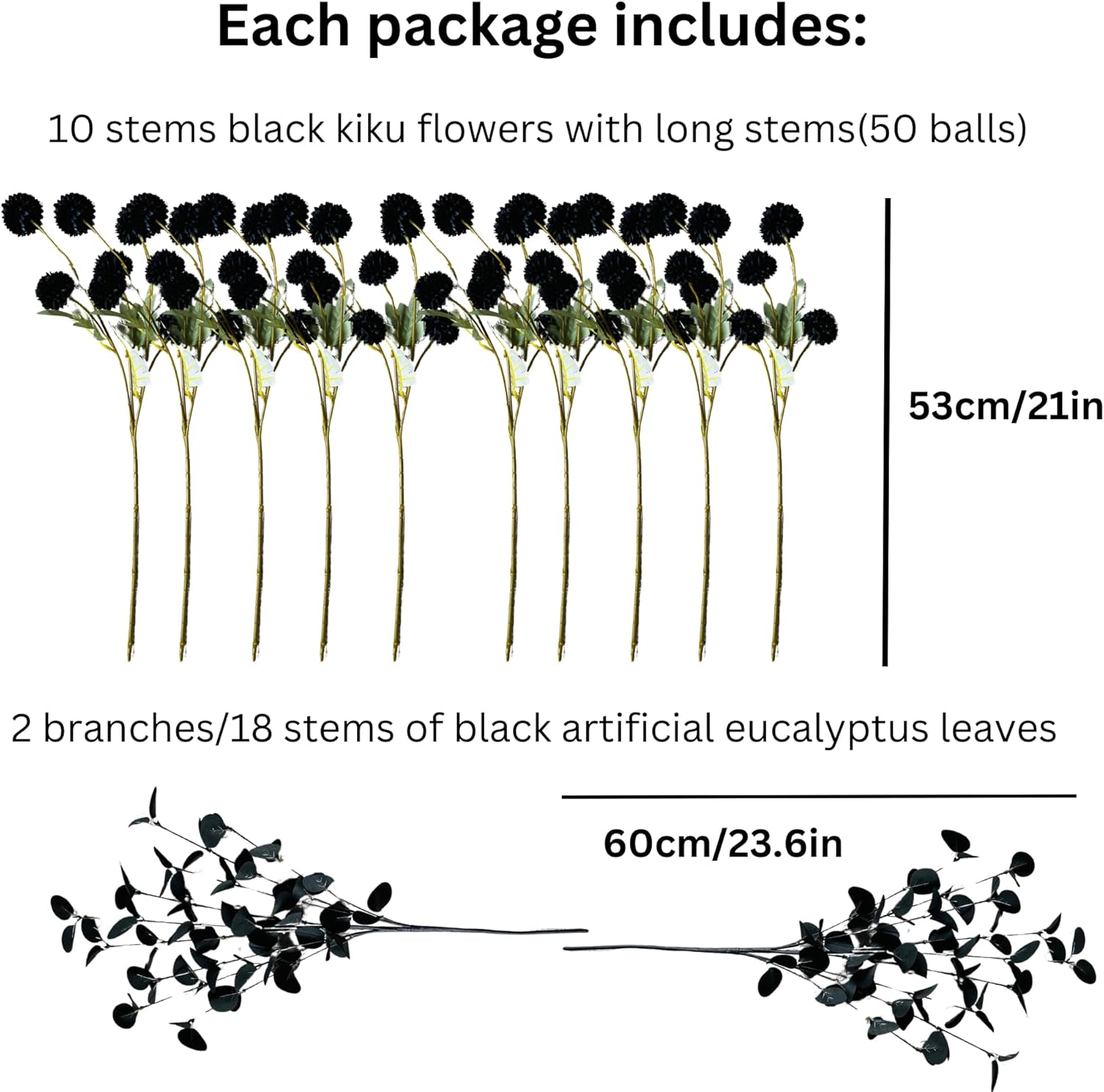 - Faux Flowers Bulk for Maximum Creativity: This bulk package includes 10 long stems black flower and two branches of black eucalyptus stems. This can be used as floral picks to customize in your floral arrangements. Perfect for DIY enthusiasts, these black artificial flowers bulk provide endless possibilities for your home decor projects. Use them to create stunning Halloween floral bouquets or elegant fall floral decorations.
