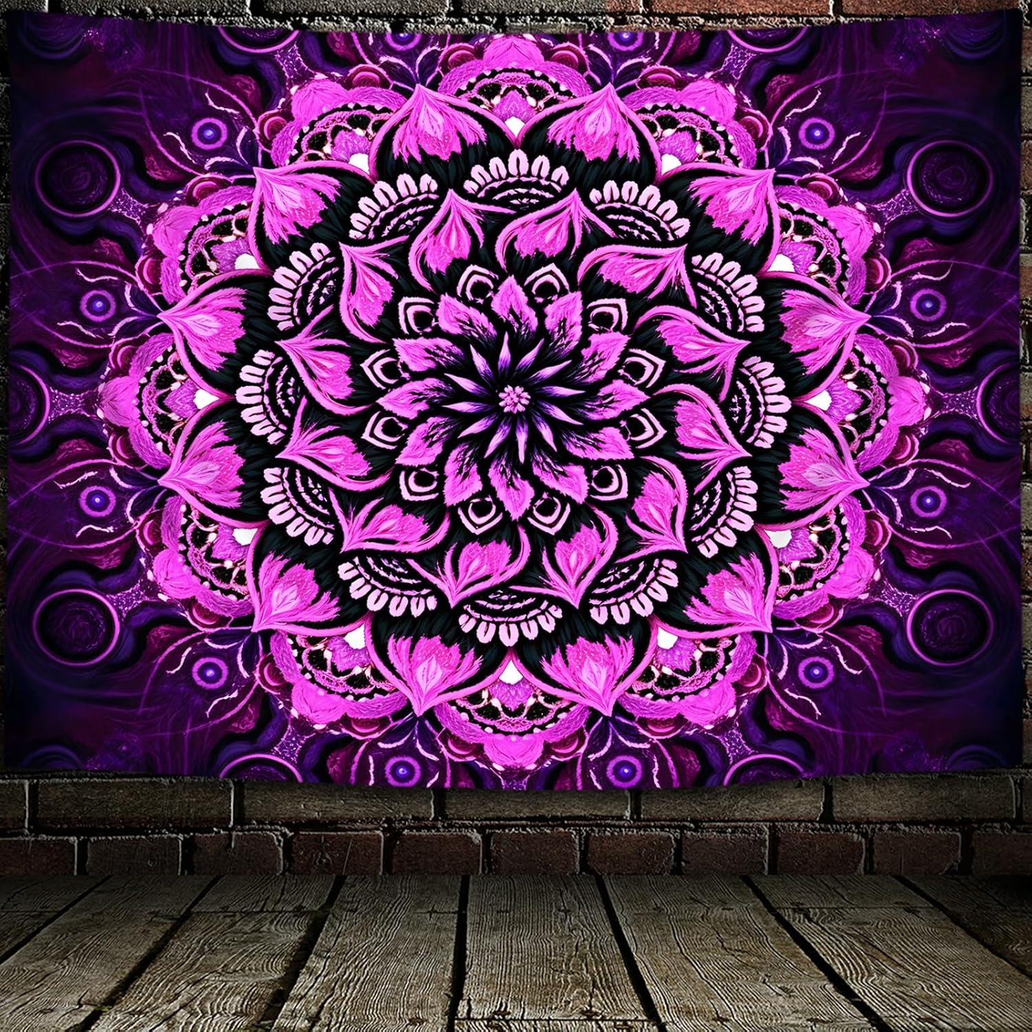 Blacklight Mandala Tapestry Wall Hanging, Psychedelic Flower Black Light Posters for Adults and Teens, UV Reactive Aesthetic Bohemian Art for Bedroom (60 x 50 Inches)
