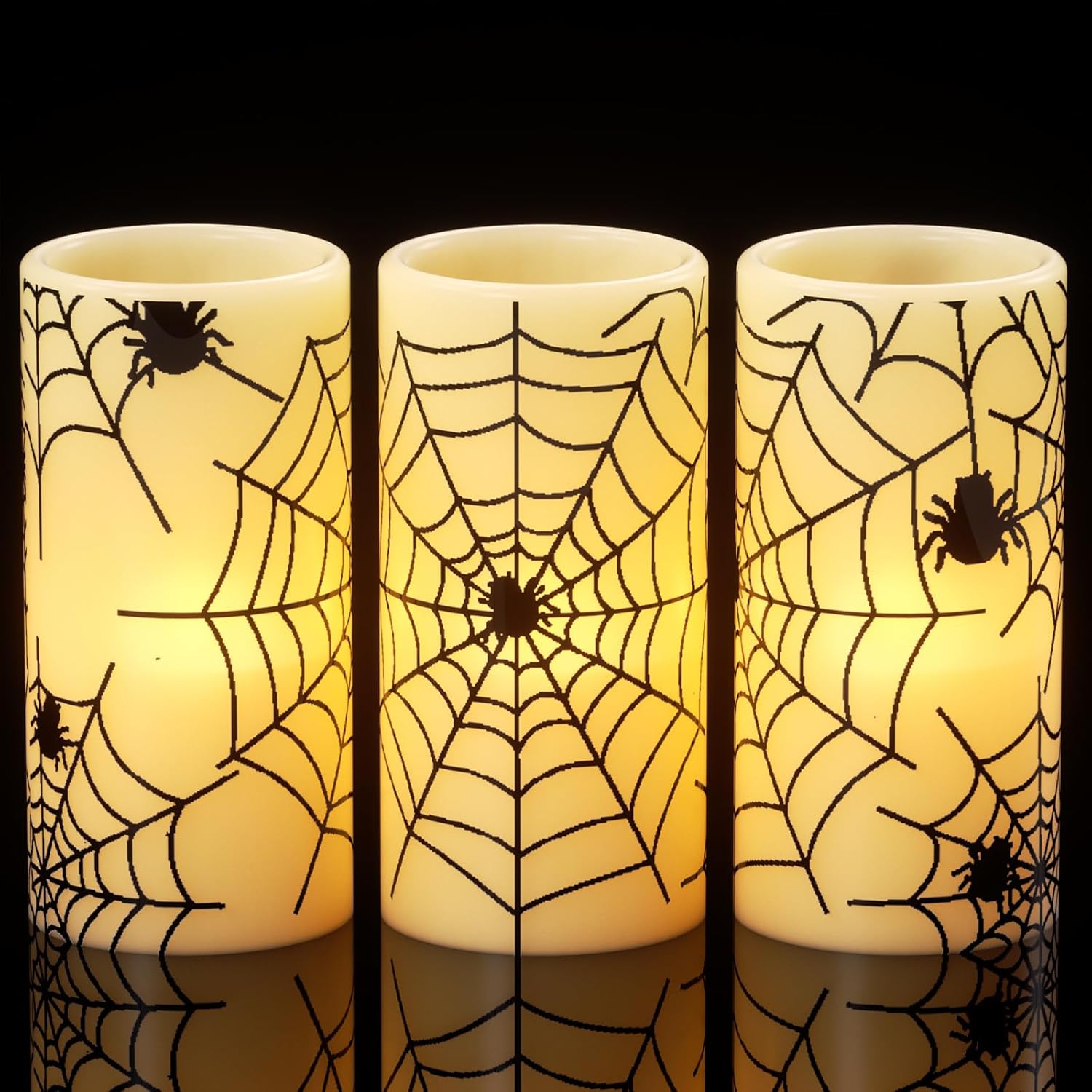 - REALISTIC FLICKERING APPEARANCE: Built-in wick realistic flicker make our led candles look like real candles. Warm light glow with spider decals create Halloween atmosphere when use as Halloween party, horrorible theme party decoration