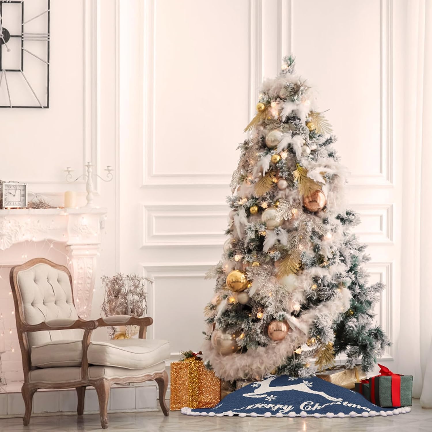 - Merry Christmas Tree Skirts:Our xmas tree skirt is printed with elk and various sizes of snow patterns, as well as the words "Merry Christmas." The edges are adorned with small, fluffy balls, adding a festive touch to your Christmas tree. This 48-inch tree skirt is perfectly sized for most Christmas trees perfectly. Before making a purchase, please measure the diameter of your tree to ensure a perfect fit