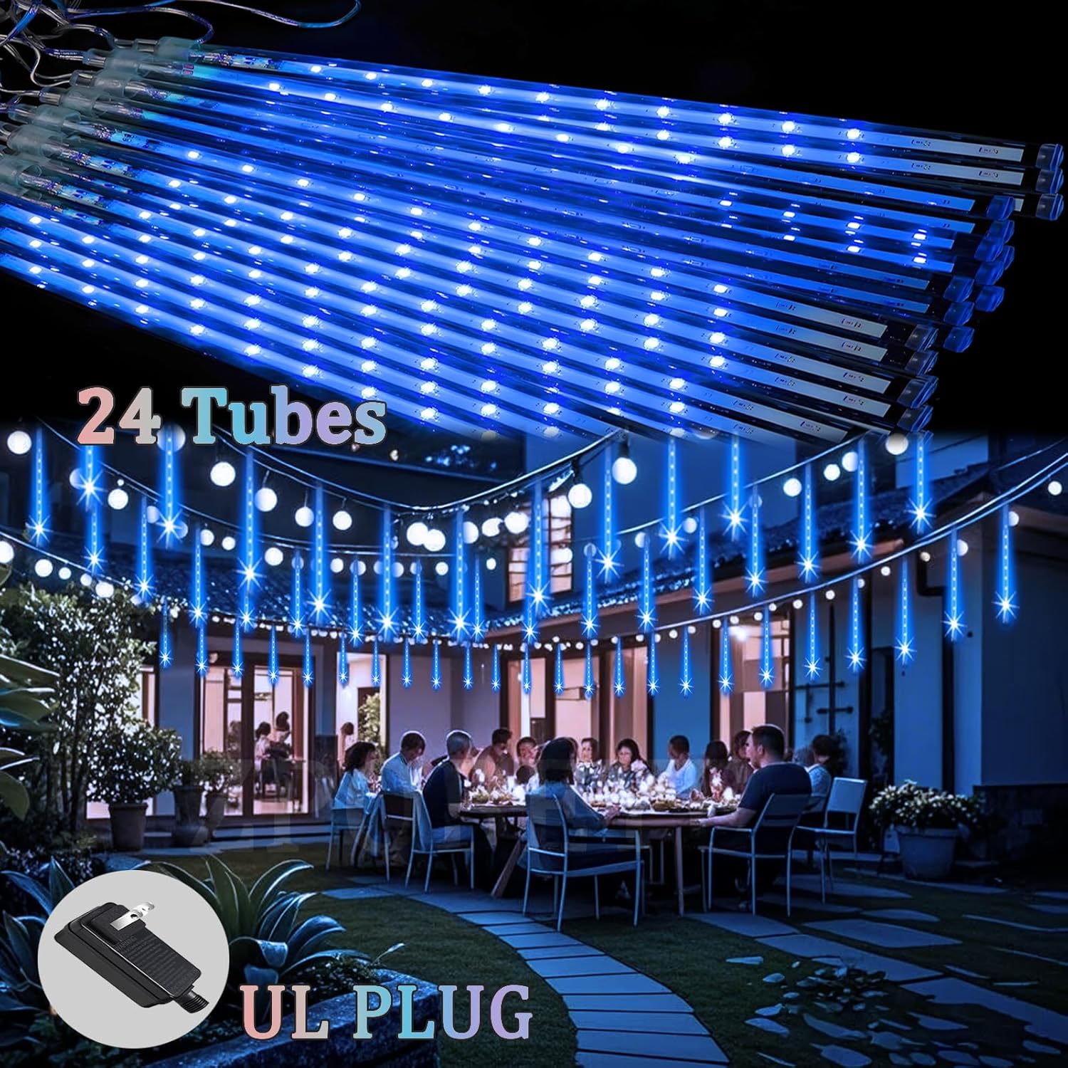 Christmas Lights Outdoor Meteor Shower Lights 24-Tube 576LEDs Snow Falling Rain Cascading Icicle Light for Xmas Tree Christmas Decorations Wedding Party Holiday Garden Decor, UL Plug Blue