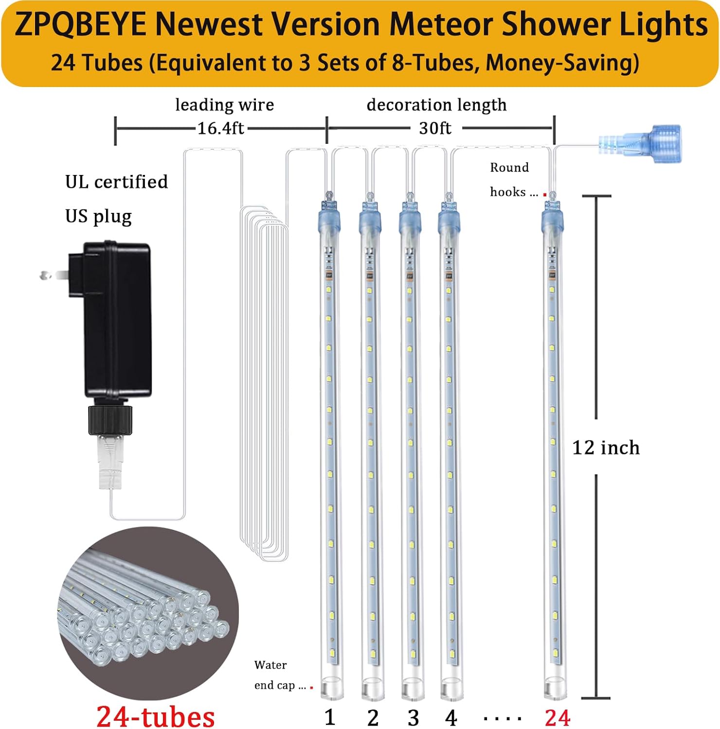 - NEW UPGRADED 24 Tubes Meteor Shower Lights: ZPQBEYE Christmas lights outdoor have 24 tubes (equivalent to 3 sets of 8-tube), 576 LEDs attached on both sides, adopted super bright LED chips, providing 360 degree shining angles, which makes the falling rain drop lights much brighter and more attractive. When dark falls, each bulb twinkles with a romantic glow, opening and closing in succession, resembling a meteor shower or drifting snow, creating a breathtakingly beautiful effect