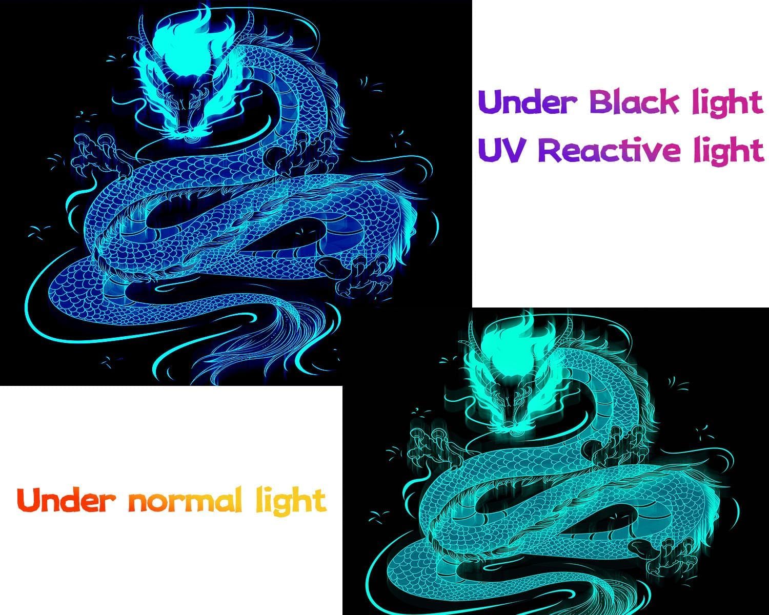 - UV REACTIVE / BLACK LIGHT: Dragon poster blacklight is printed with the latest heat transfer technology and UV reactive inks to produce a neon effect under black light. The actual visual effect depends on the power of the light you use, our pictures are taken under 40w 366nm UV light