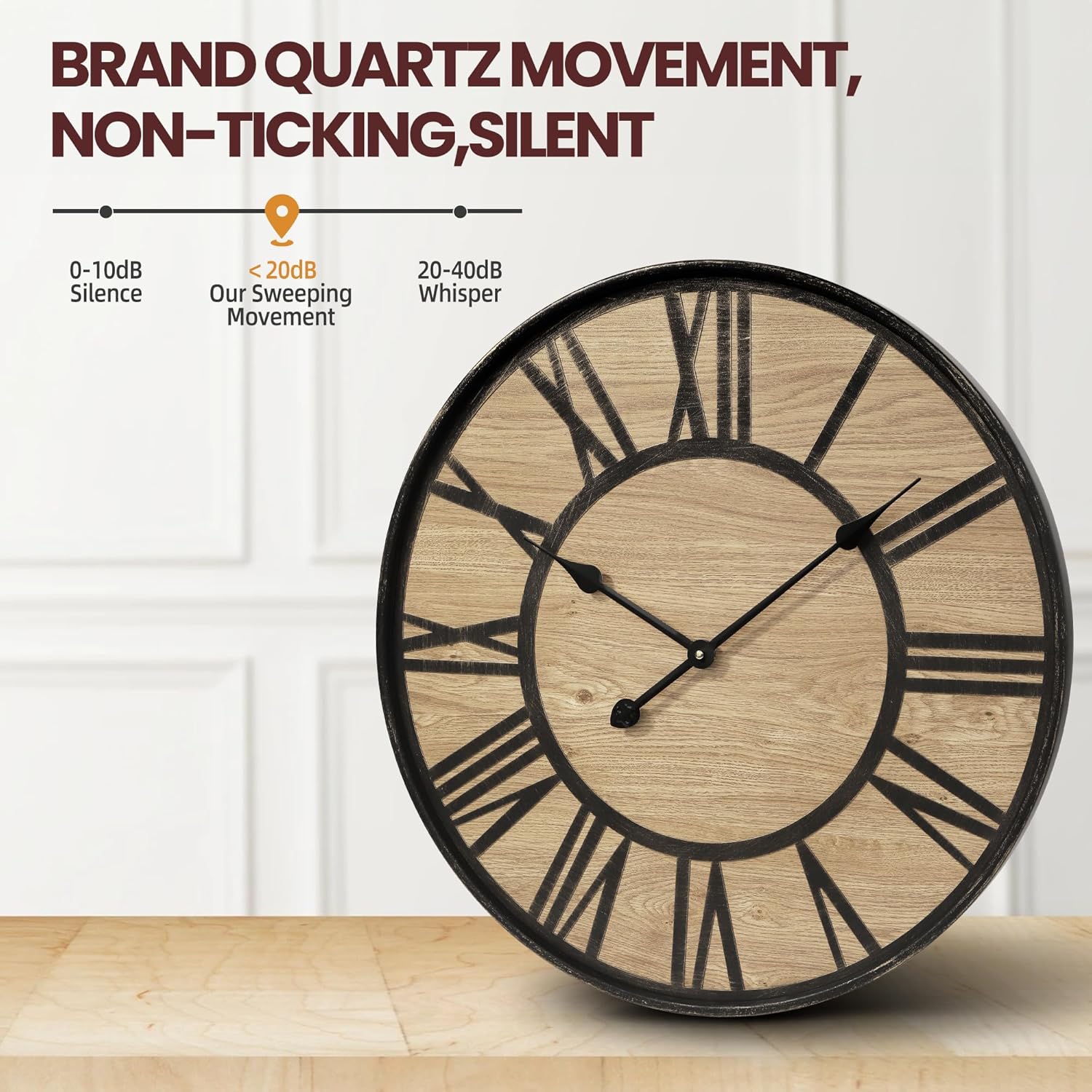 Large Wall Clock for Living Room Decor, Non Ticking Silent, Battery Operated Modern Vintage Wood Oversized Decorative Wall Clock for Bedroom Kitchen Farmhouse Office Decor