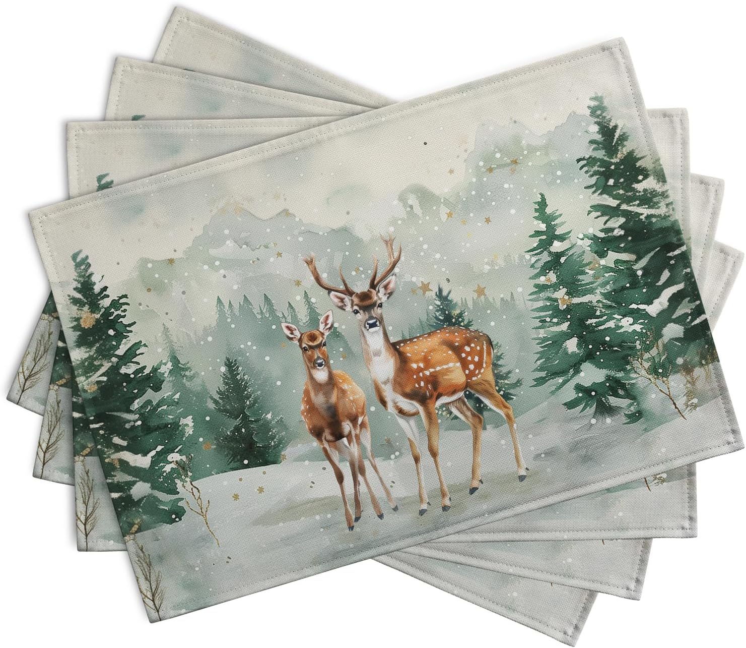 Christmas Watercolor Deer Trees Snowflakes Placemats Set of 4 Winter Rustic Nature Forest Linen Table Mat 12x18 Inch Seasonal Farmhouse Washable Place Mats for Dining Table Kitchen Xmas Decor
