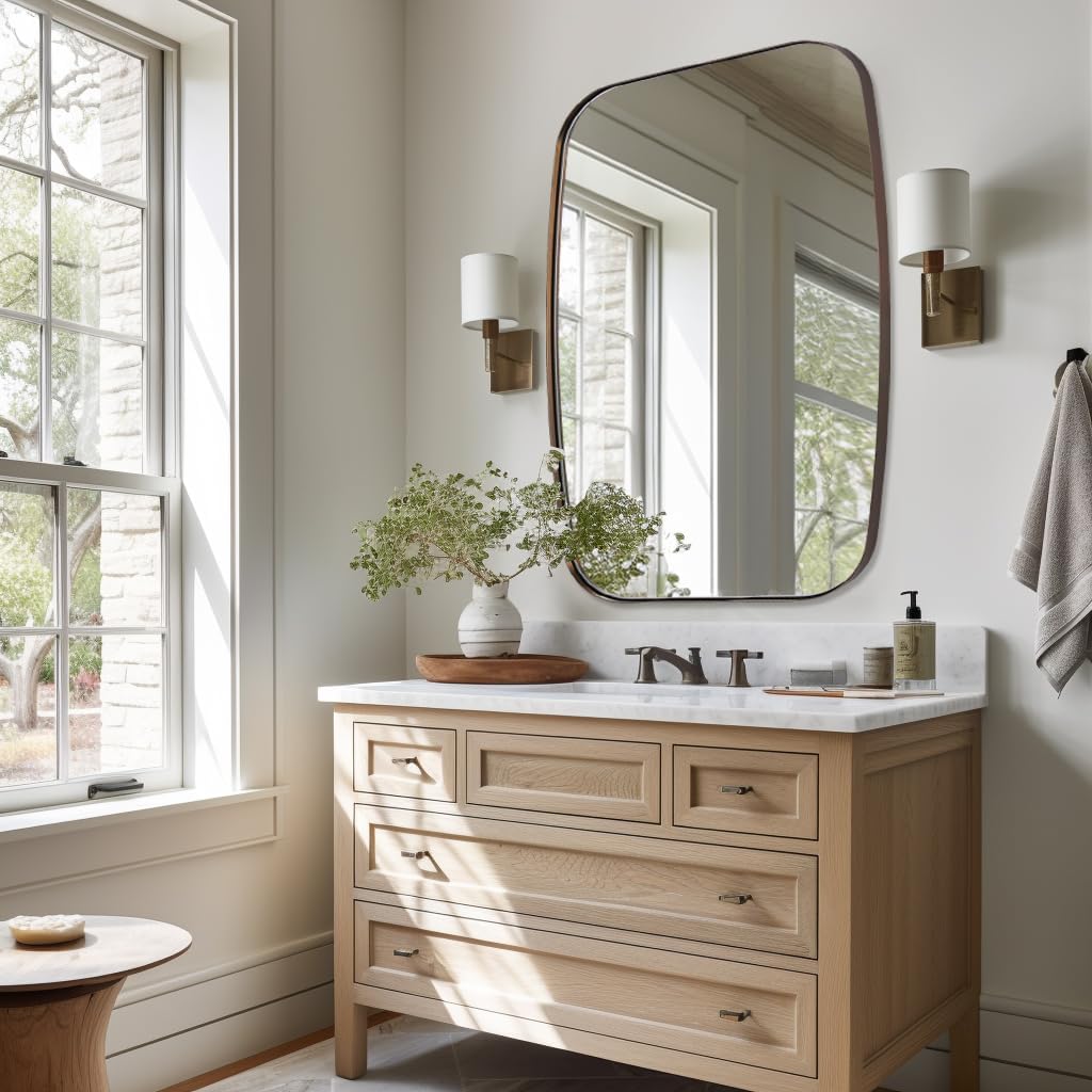 - Excellent Performance: A sleek, modern stainless steel metal frame surrounds a unique oblong mirror; sets it apart from traditional oval or rectangular mirrors; brushed bronze finish complements your bathroom; adds light and space to the room